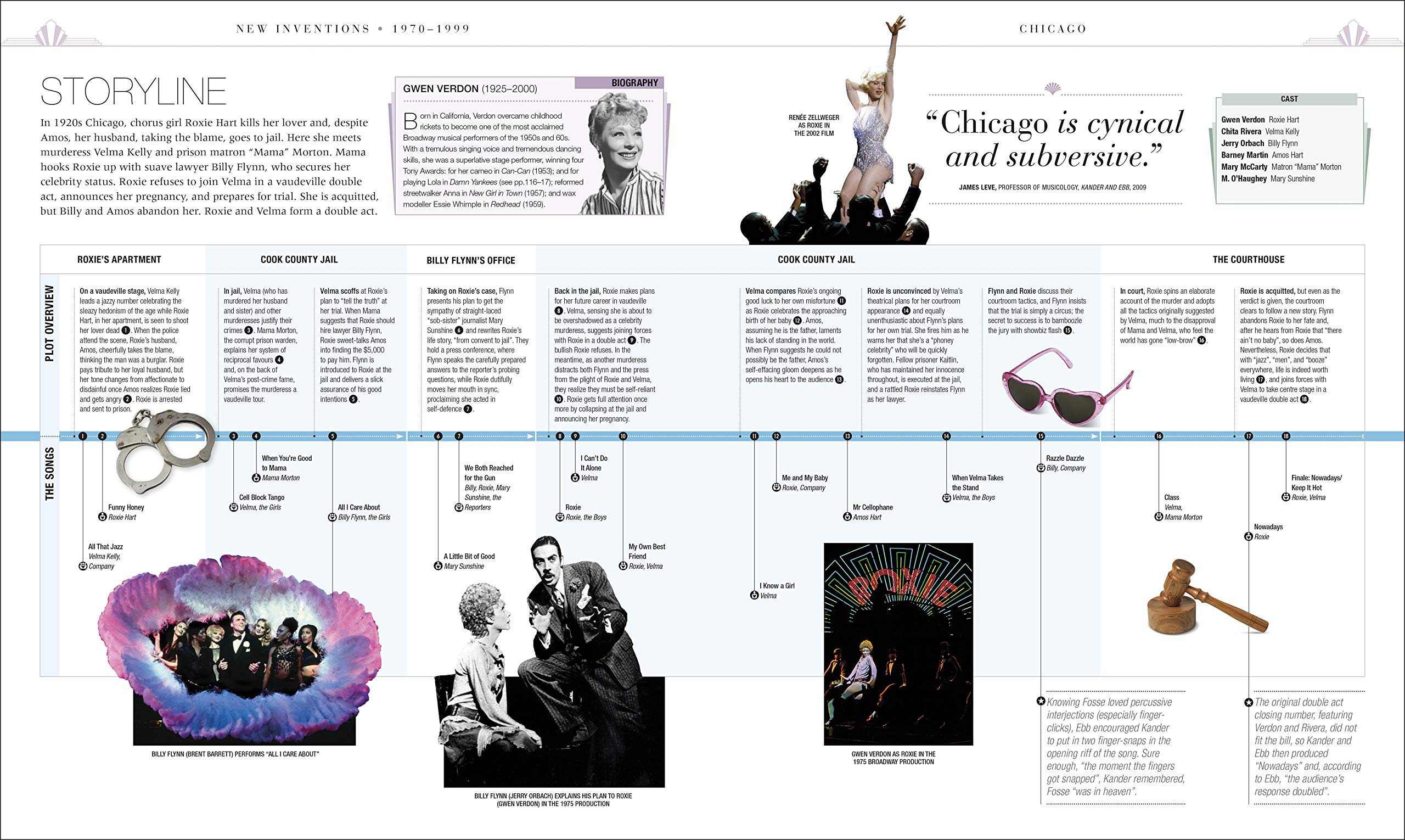 - Neat timelines summarise the plot, characters, and songs for 20 top musicals