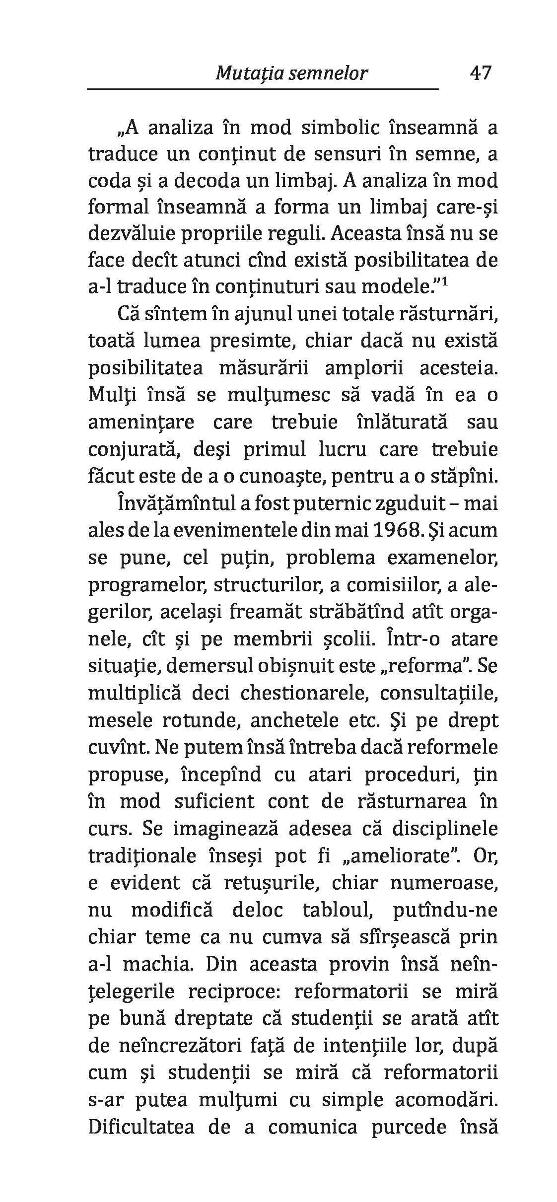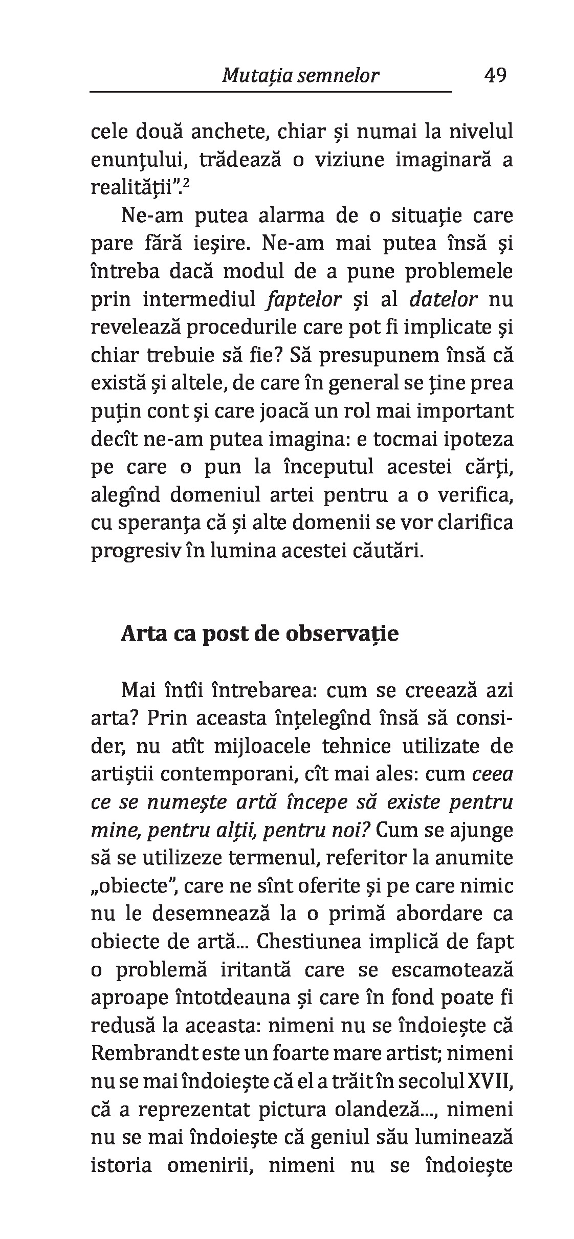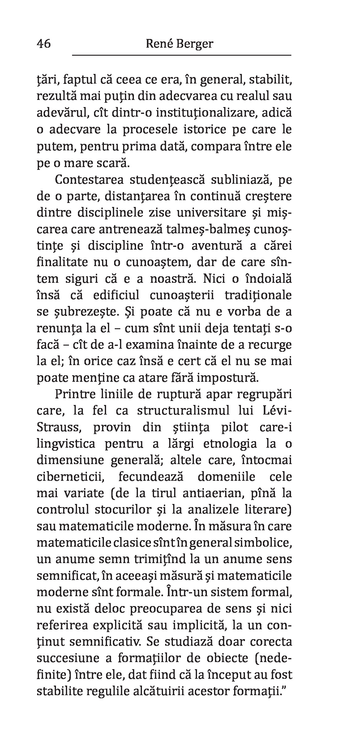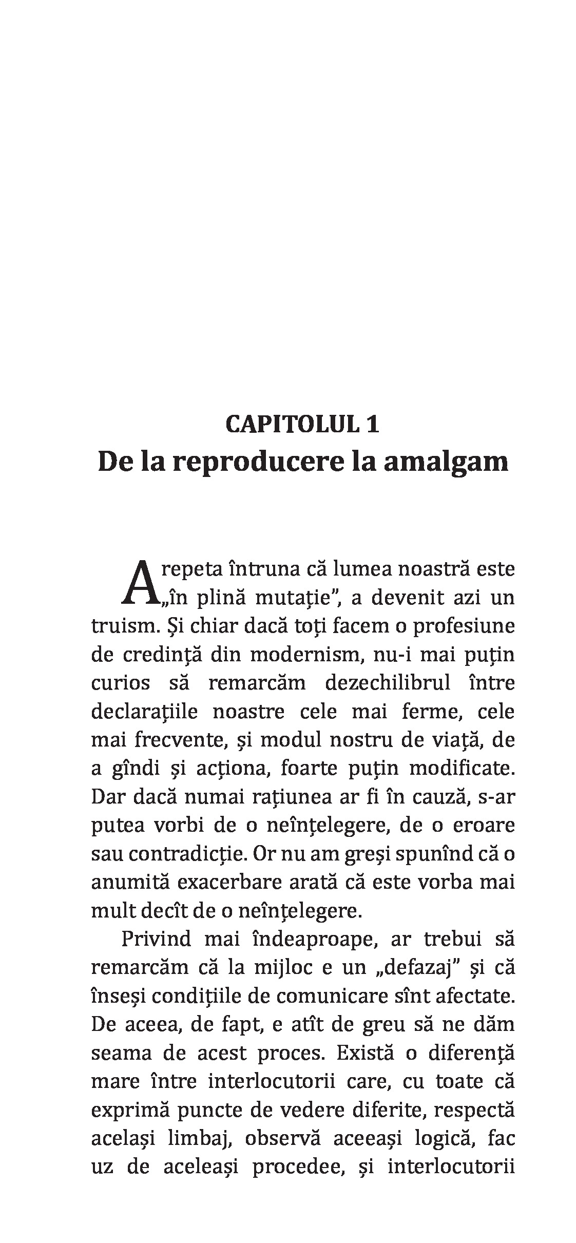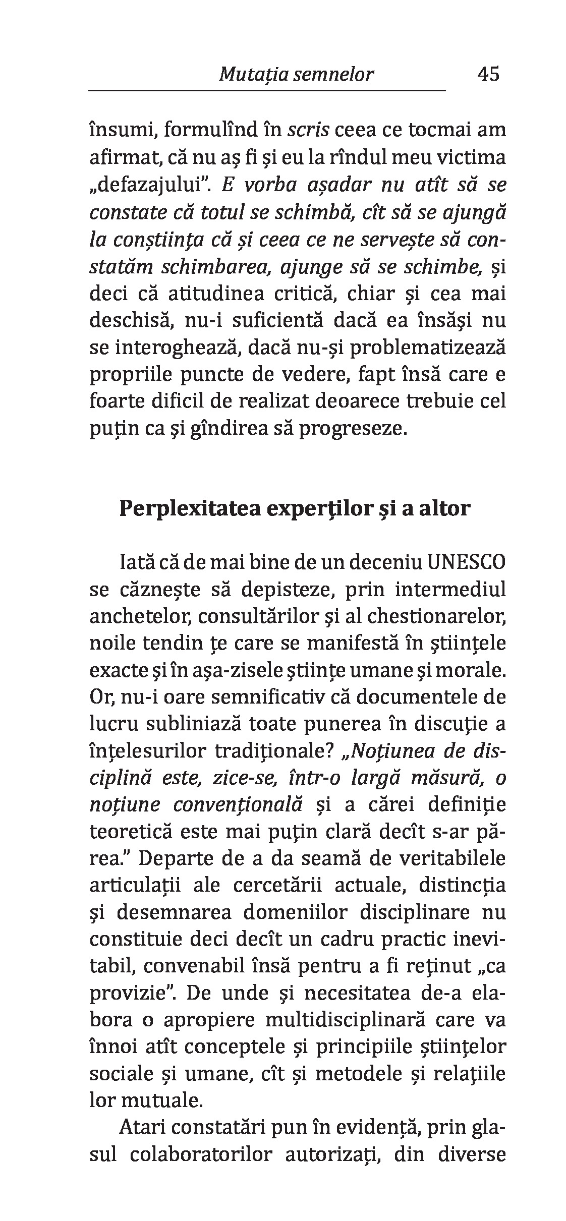 Cititorul e invitat deci să-și schimbe puțin obiceiurile. Ca și autorul, de altfel, condiționat și el de formația sa intelectuală, pentru a-i zice pe nume, chiar dacă definirea e aproximativă, formație care pune accentul pe analiză, sinteză, demonstrație. Or, în măsura în care se mărginește la aceste proceduri „serioase”, fondat pe un obiect și pe raționamentul care i se aplică, progresul e sigur, rămânând însă pe alături de fenomenele neconstituite încă în obiecte ale cunoașterii. La nivelul, pe care l-am putea numi astfel, al emergenței, fenomenele sunt de fapt mai confuze și mai prost identificate, constituindu-se într-o disciplină, deseori și ea încă inexistentă, abia după un timp de la șocul pe care l-au produs asupra rațiunii.