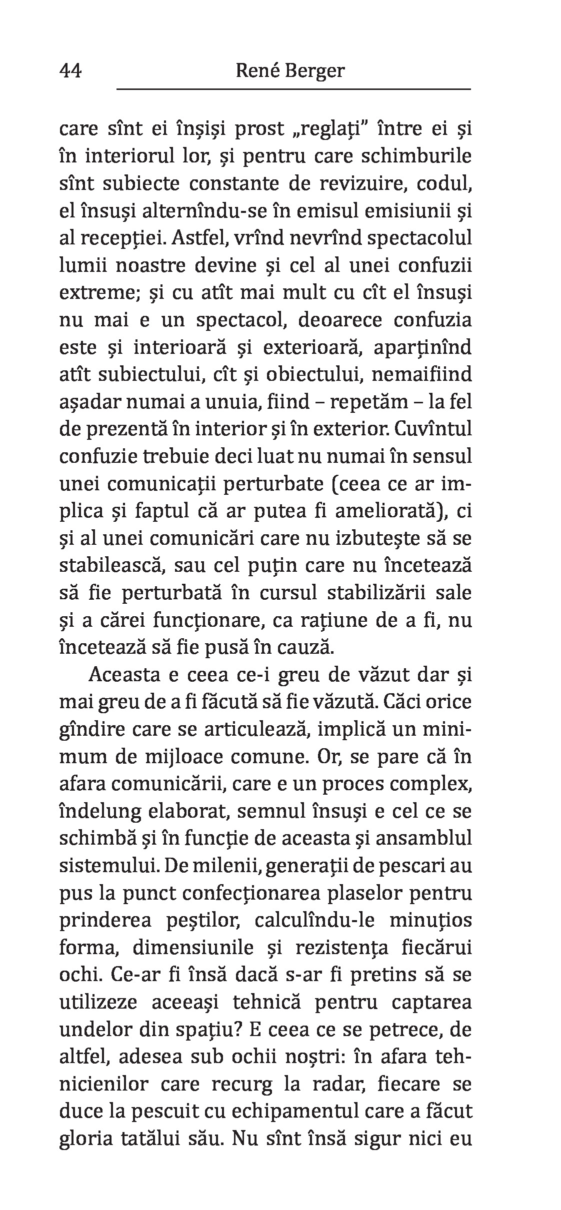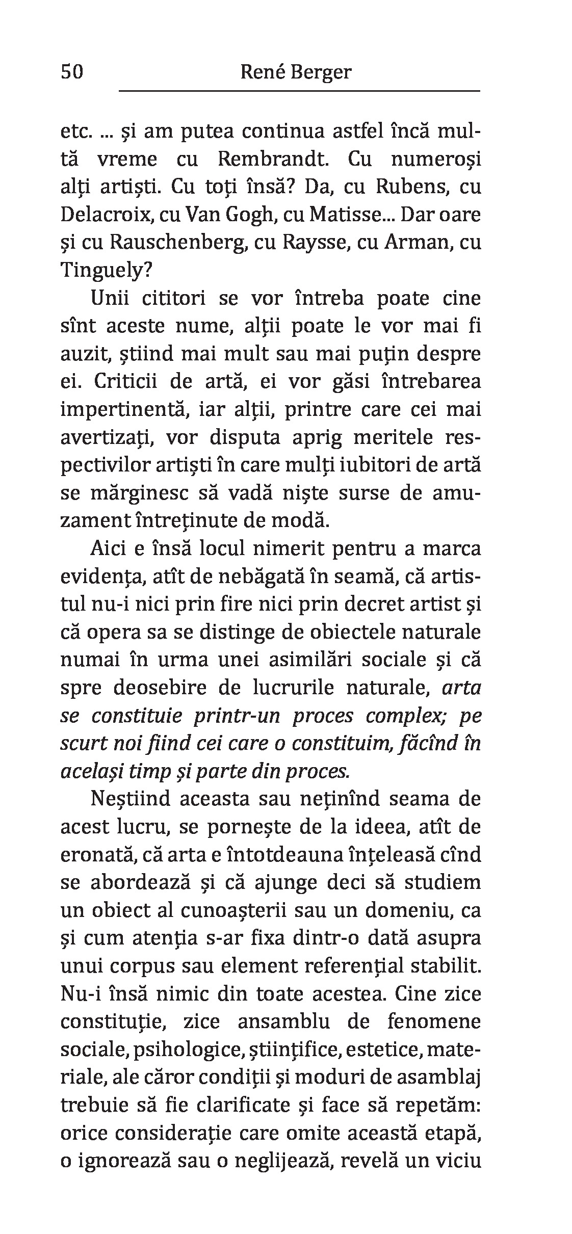 Luând, așadar, act de mutațiile și deplasările extraordinare ce s-au produs în sfera culturii și civilizației contemporane, René Berger și-a propus să exploreze legăturile dintre artă și lumea științei și tehnicii, efectele inedite care apar în raporturile artei cu mijloacele comunicării de masă îndeosebi.