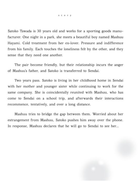When Mashuu doesn't make the first team, Satoko continues to work with him, encouraging him not to quit and supporting him at the games. Their emotional connection strengthens as the two spend more and more time together, and fill the emptiness in each other's lives. Mashuu comforts Satoko after her ex-boyfriend betrays her.