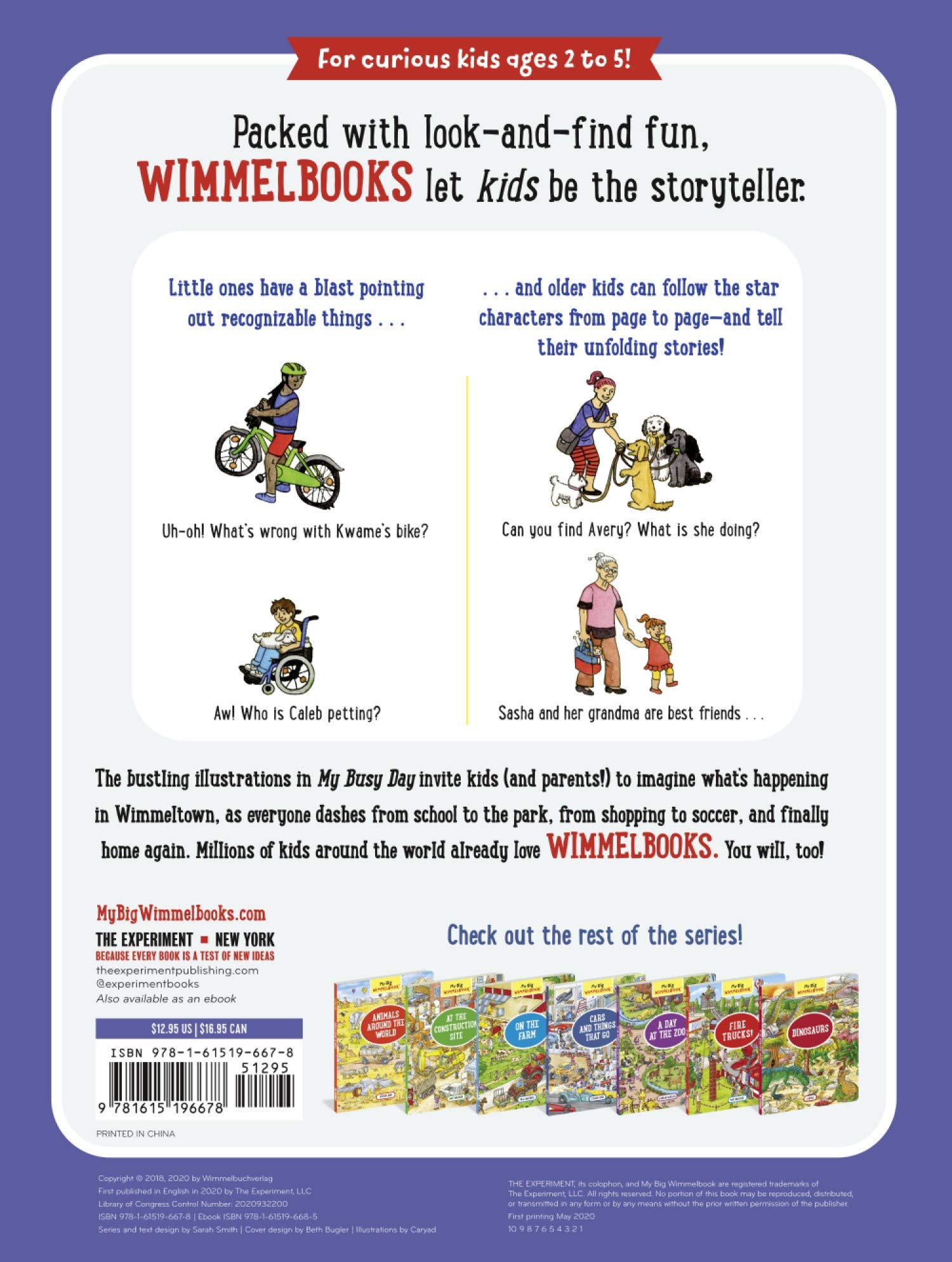 My Big Wimmelbook—My Busy Day invites readers to join a lively group of kids, families, friends, and workers as they go about their normal daily routines. From starting with a healthy breakfast to an exciting day at school, swinging in the park, and more, readers will have a blast recognizing their own daily lives reflected in the many activities packed into this single bustling day in Wimmeltown.