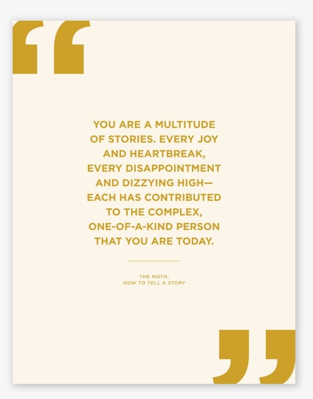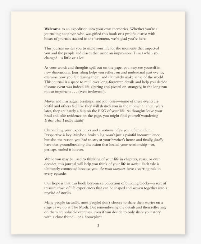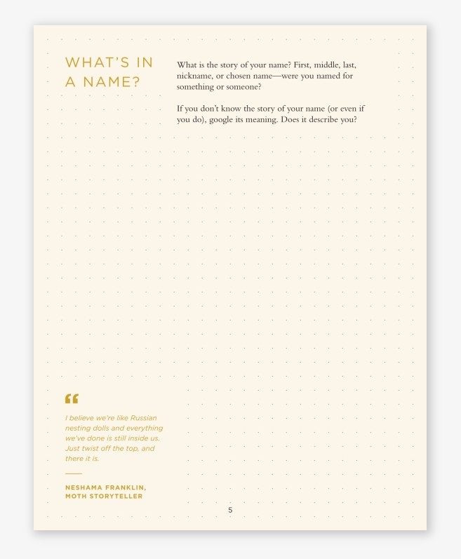With over 150 insightful prompts and a removable timeline, The Moth’s storytelling experts help you not only identify important milestones and details from your life, but also shape them into stories.