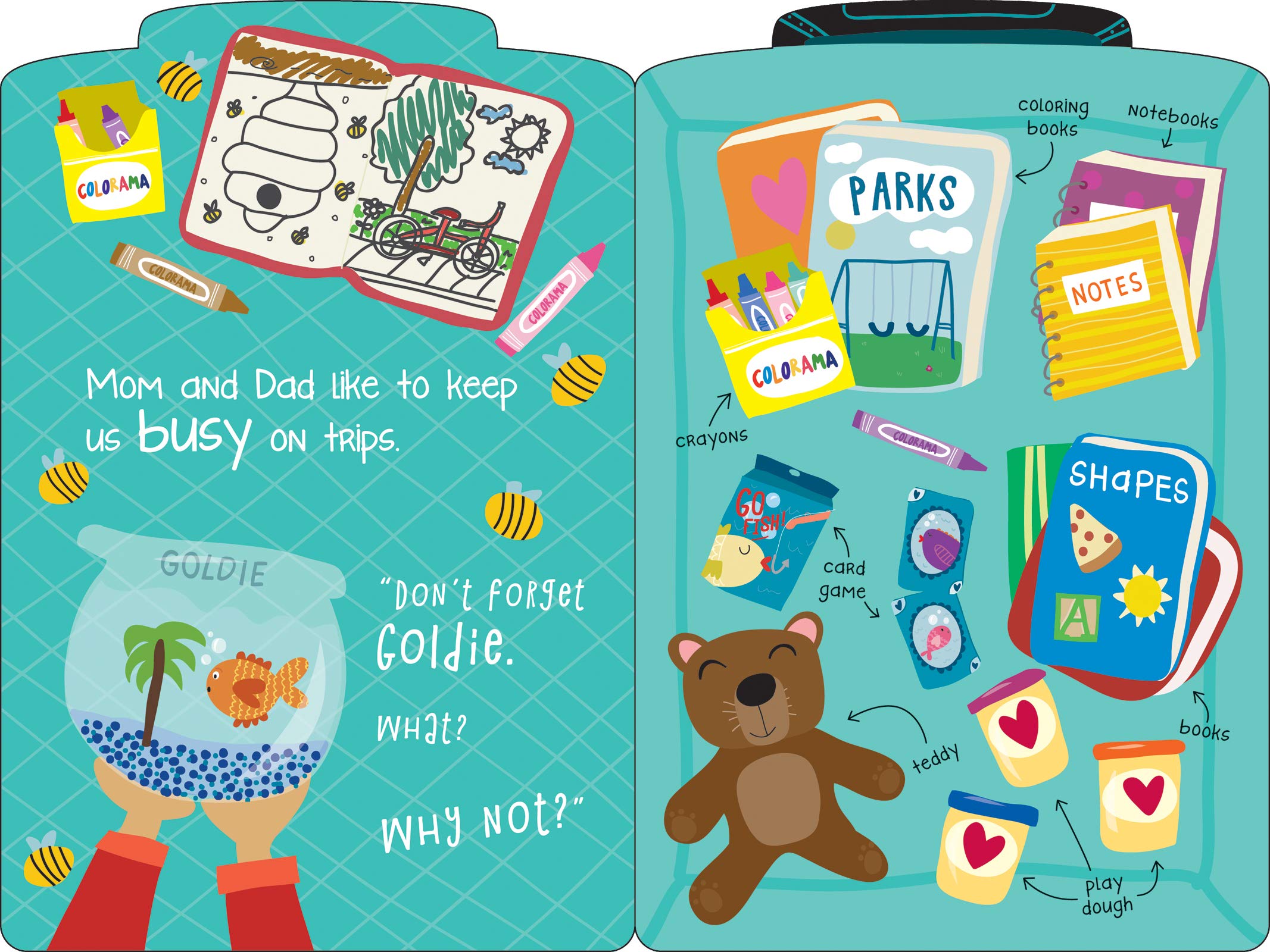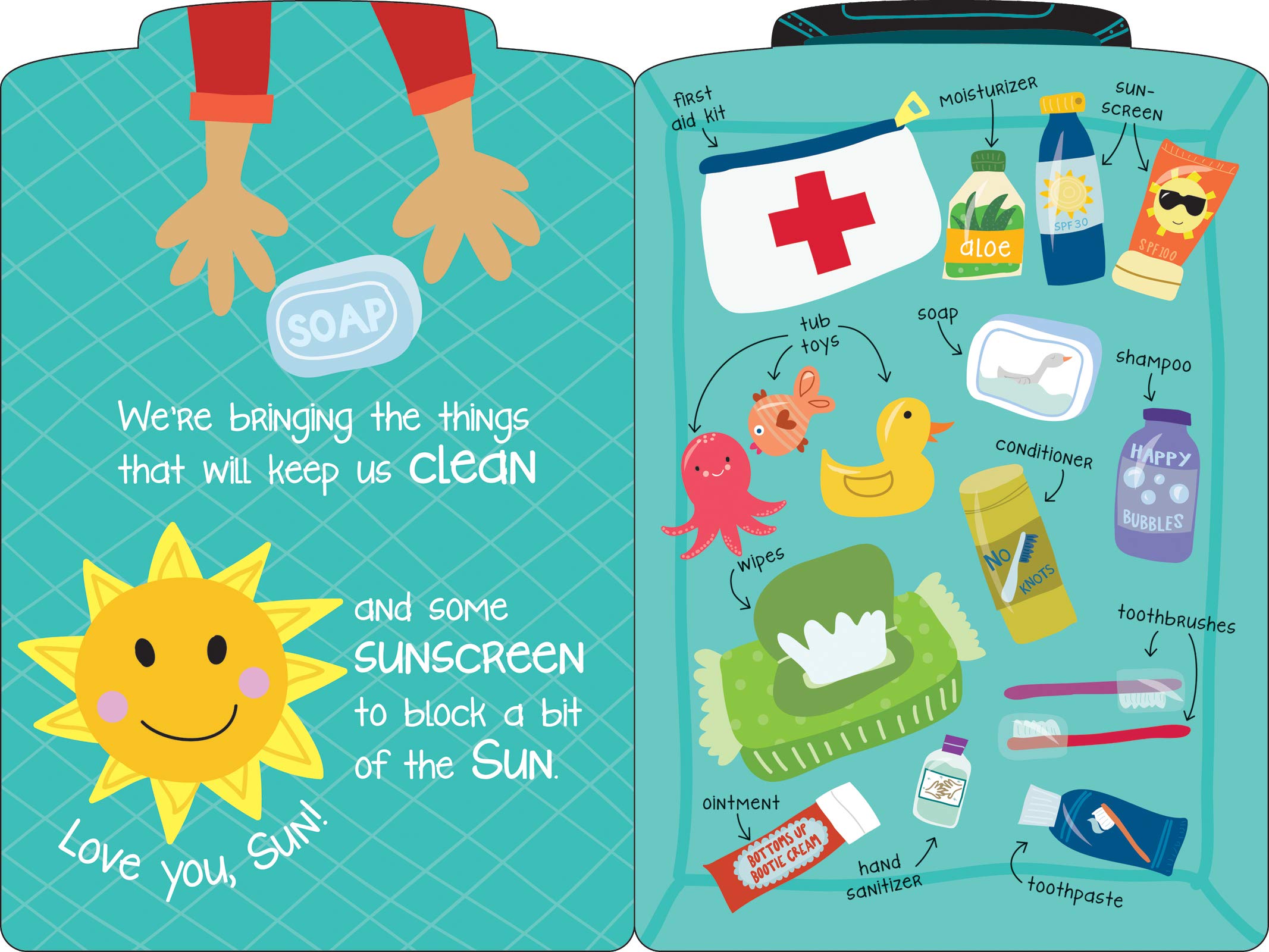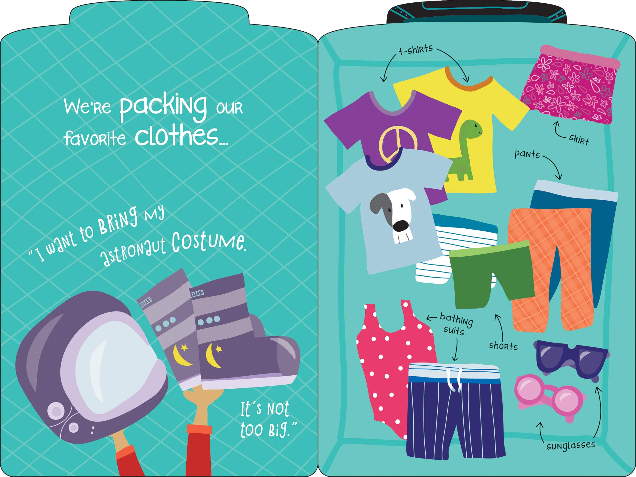 Each spread introduces a different category of items, such as toiletries, toys, or snacks, and all objects are brightly illustrated and labeled so that children know exactly what they're seeing. The playful artwork and friendly, simple text make this book the perfect companion for little travelers, keeping them engaged on those long car rides or flights.