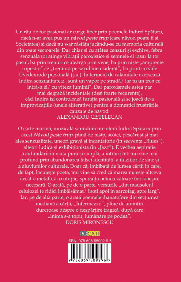 Un râu de foc pasional ar curge liber prin poemele Indirei Spătaru, dacă n-ar avea pus un năvod peste trup (care năvod poate fi şi Societatea) şi dacă nu s-ar răsfăţa jucându-se cu memoria culturală din toate sectoarele. Dar chiar şi cu atâtea cenzuri şi eschive, febra senzuală tot atinge vibraţii paroxistice şi semnele ei răsar la tot pasul, ba prin trenuri ce aleargă prin vene, ba prin nişte „amprente rupestre” ce „tremură pe sexul meu siderat”, ba printr-o vale Uvedenrode personală (ş.a.). În termeni de calamitate exersează Indira senzualitatea: „sunt un vapor pe stradă/ iar tu un tren ce intră-n el/ cu viteza luminii”. Dar paroxismele astea par mai degrabă incidentale (deşi foarte recurente), căci Indira îşi controlează turaţia pasională şi se joacă de-a improvizaţiile (unele aliterative) pentru a domestici frustrările cauzate de năvod.