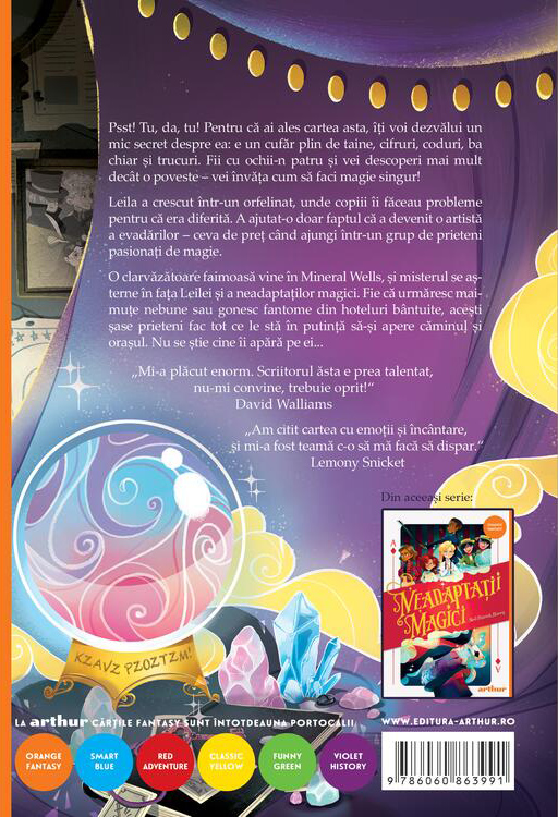 Volumul pe care îl ții acum în mână povestește următorul capitol din saga magicienilor noștri neadaptați. Ca și cea de dinainte, această carte este plină de lecții de magie – lecții pe care le poți exersa în dormitorul sau subsolul tău, sau în sala de sport a școlii. Dacă le citești în întregime – atât povestea, cât și lecțiile –, cel mai probabil vei dobândi la final propriile îndemânări – îndemânări pe care le poți folosi să i lași pe prietenii tăi cu gura căscată și chicotind de mulțumire. S ar putea să fie chiar și râsete și aplauze. Fiindcă, la urma urmei, nu despre asta e vorba: să i faci pe prietenii tăi să zâmbească și să le oferi o evadare din normalitatea vieții de zi cu zi?