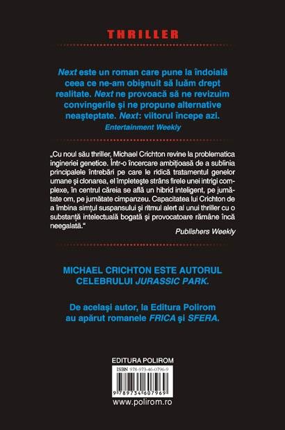 Cu Next (2006), parintele tehno‑thrillerului nu merge atit de departe incit sa recreeze dinozauri, asa cum o facuse in Jurassic Park: cel mai recent roman al sau este un atac direct impotriva industriei ingineriei genetice din Statele Unite, o privire sumbra asupra unui viitor nu foarte indepartat in care legile ce guverneaza industria genetica permit orice combinatie, iar stiinta nu mai este in slujba omului, ci in cea, mult mai profitabila, a banului. Roman incredibil de inteligent, Next combina realitatea si fictiunea, descriind o minunata lume noua in care nimic nu este ceea ce pare, iar posibilitatile industriei viitorului sint infinite.