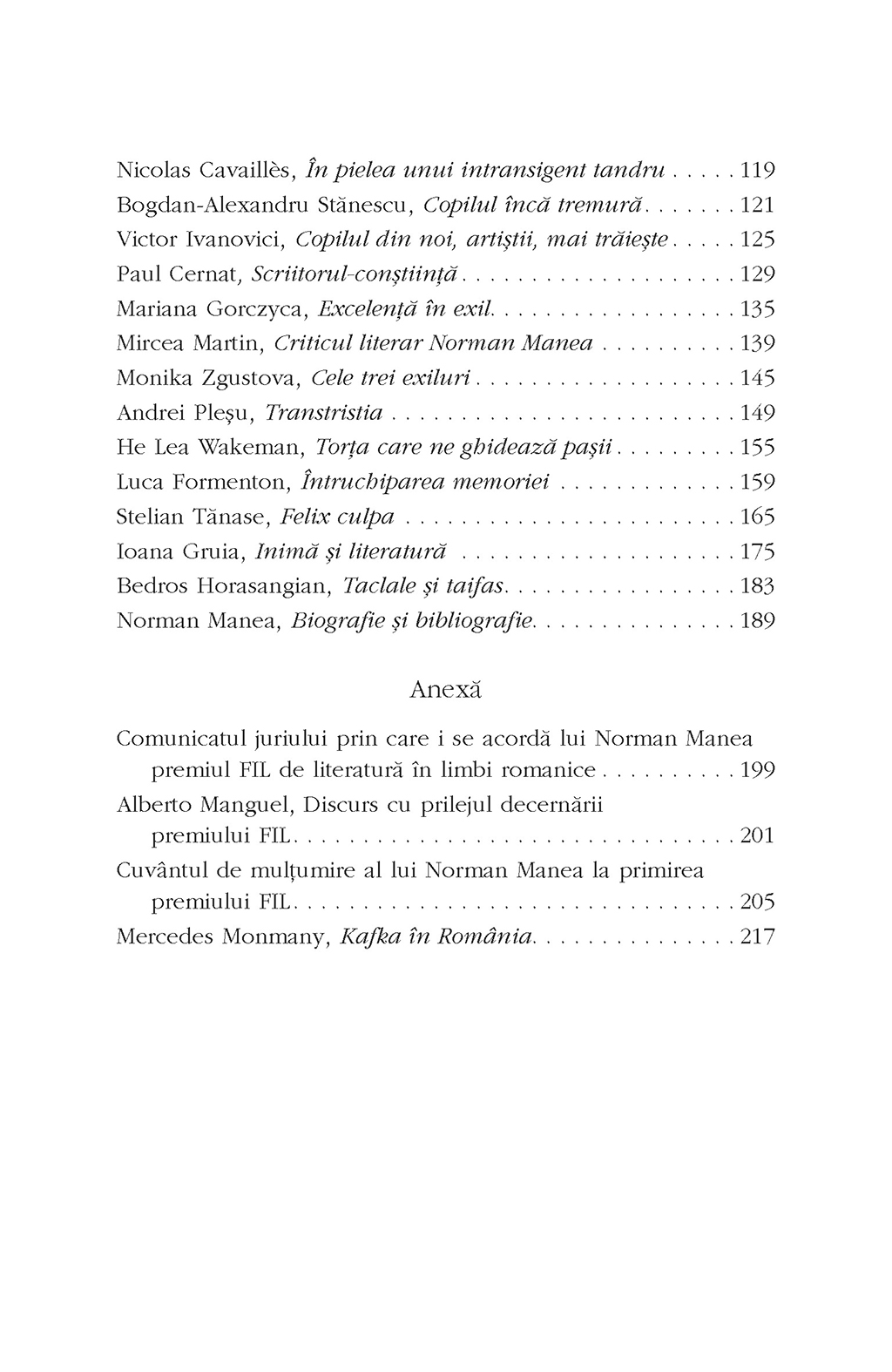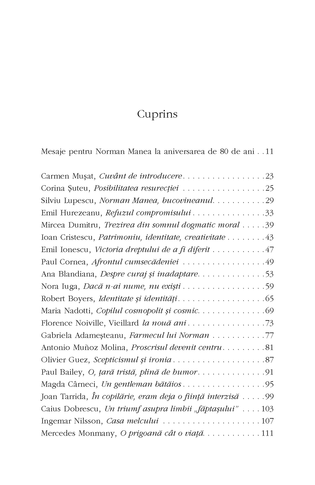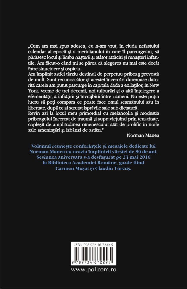 Volumul reuneşte conferinţele şi mesajele dedicate lui Norman Manea cu ocazia împlinirii vîrstei de 80 de ani. Sesiunea aniversară s-a desfăşurat pe 23 mai 2016 la Biblioteca Academiei Române, gazde fiind Carmen Muşat şi Claudiu Turcuş.