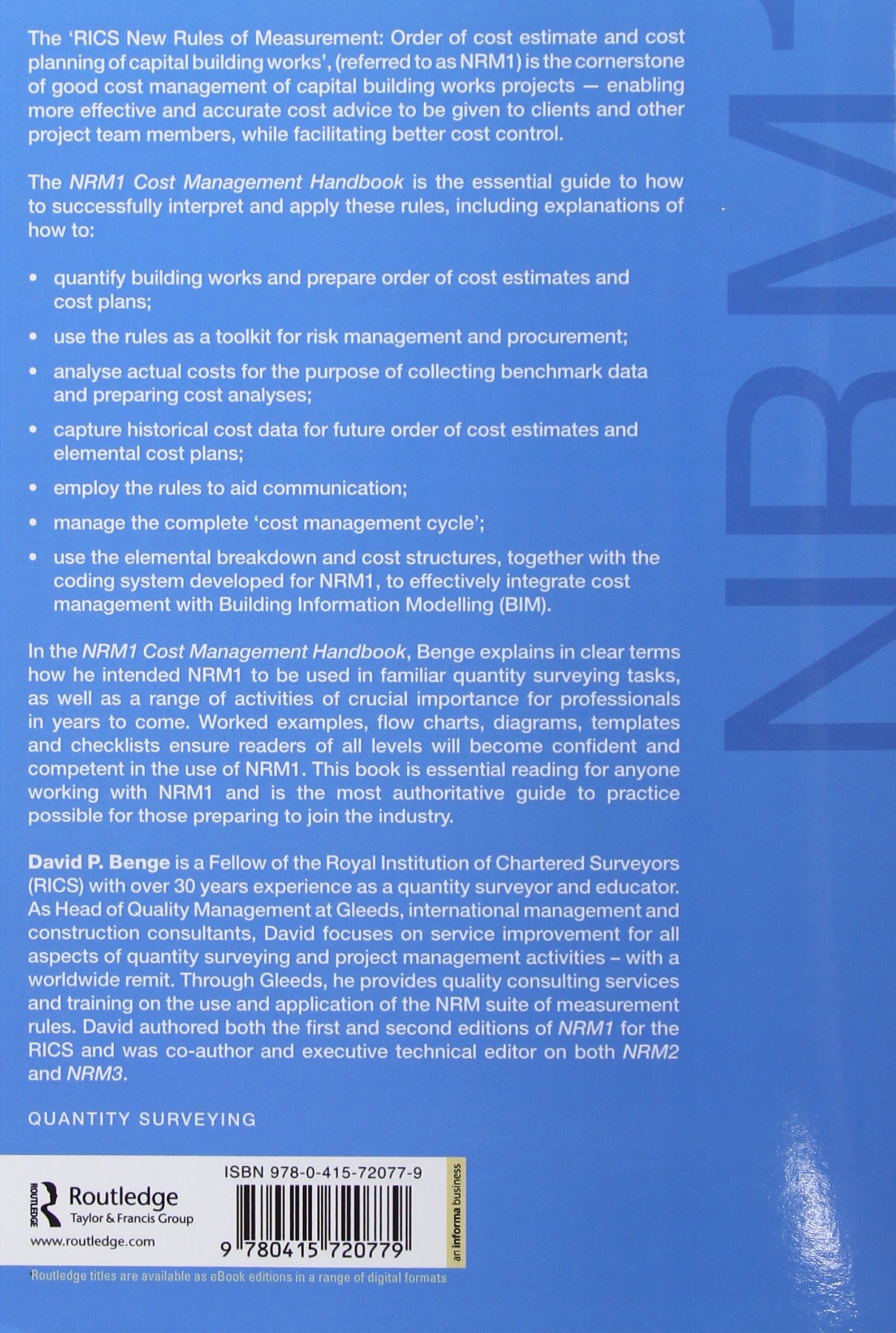 In the NRM1 Cost Management Handbook, David Benge explains in clear terms how NRM1 is meant to be used in familiar quantity surveying tasks, as well as a range of activities of crucial importance for professionals in years to come. Worked examples, flow charts, diagrams, templates and check lists ensure readers of all levels will become confident and competent in the use of NRM1. This book is essential reading for anyone working with NRM1, and is the most authoritative guide to practice available for those preparing to join the industry.