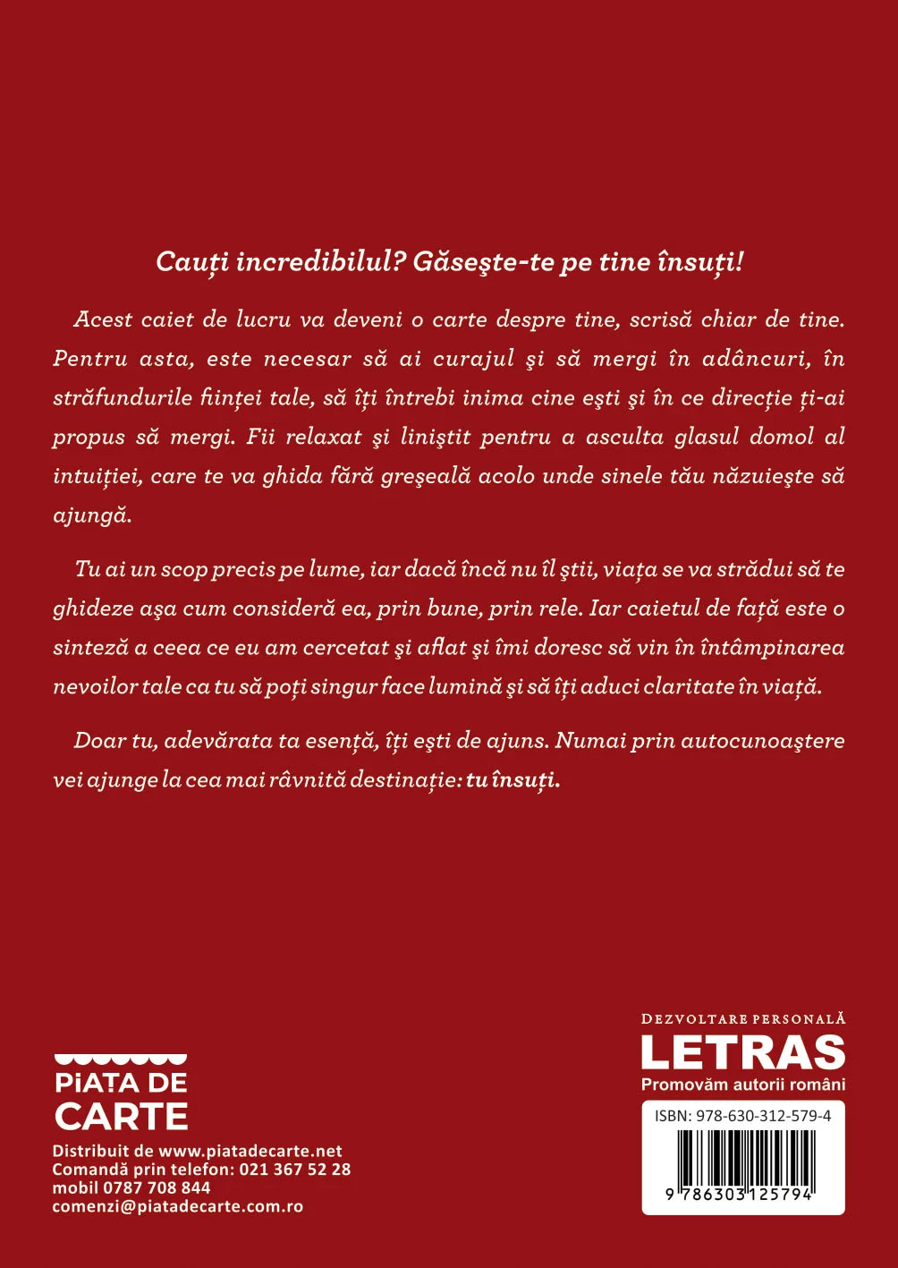 Acest caiet de lucru va deveni o carte despre tine, scrisa chiar de tine. Pentru asta, este necesar sa ai curajul si sa mergi in adancuri, in strafundurile fiintei tale, sa iti intrebi inima cine esti si in ce directie ti-ai propus sa mergi. Fii relaxat si linistit pentru a asculta glasul domol al intuitiei, care te va ghida fara greseala acolo unde sinele tau nazuieste sa ajunga.