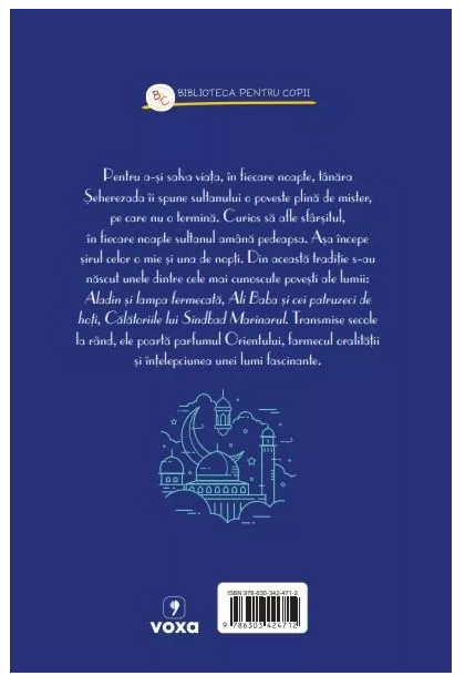 Curios să afle sfârșitul, în fiecare noapte sultanul amână pedeapsa. Așa începe șirul celor o mie și una de nopți. Din această tradiție s-au născut unele dintre cele mai cunoscute povești ale lumii: Aladin și lampa fermecată, Ali Baba și cei patruzeci de hoți, Călătoriile lui Sindbad Marinarul. Transmise secole la rând, ele poartă parfumul Orientului, farmecul oralității și înțelepciunea unei lumi fascinante.