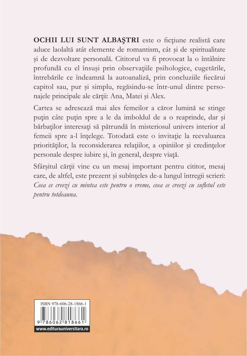 OCHII LUI SUNT ALBASTRI este o fictiune realista care aduce laolalta atat elemente de romantism, cat si de spiritualitate si de dezvoltare personala. Cititorul va fi provocat la o intalnire profunda cu el insusi prin observatiile psihologice, cugetarile, intrebarile ce indeamna la autoanaliza, prin concluziile fiecarui capitol sau, pur si simplu, regasindu-se intr-unul dintre personajele principale ale cartii: Ana, Matei si Alex.