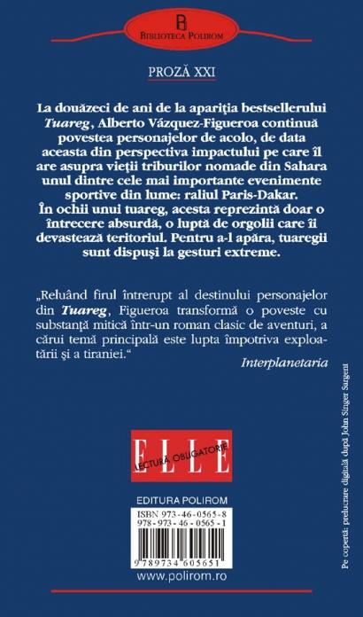 Romanul continua, dupa aproape doua decenii, povestea lui Gacel Sayah si a familiei sale, personajele centrale ale romanului Tuareg (unul dintre marile succese ale lui Figueroa, cu vinzari care au depasit trei milioane de exemplare in lumea intreaga). Ca in majoritatea cartilor anterioare ale autorului hispanic, tema centrala este impactul devastator pe care civilizatia occidentala il are asupra modului de viata traditional al unor comunitati ce au stiut sa pastreze o legatura strinsa cu natura. Pentru milioane de telespectatori din lumea intreaga, raliul Paris-Dakar este unul dintre principalele evenimente sportive ale anului, iar pentru concurenti, o ocazie de a-si demonstra calitatile si a-si testa limitele. Dar pentru tuaregi acesta nu reprezinta decit o competitie absurda, ce devasteaza teritoriul pe care il stapinesc de veacuri si ameninta sa distruga una dintre cele mai spectaculoase civilizatii ale lumii orientale. Iar pentru a se apara le ramine o singura cale: violenta.