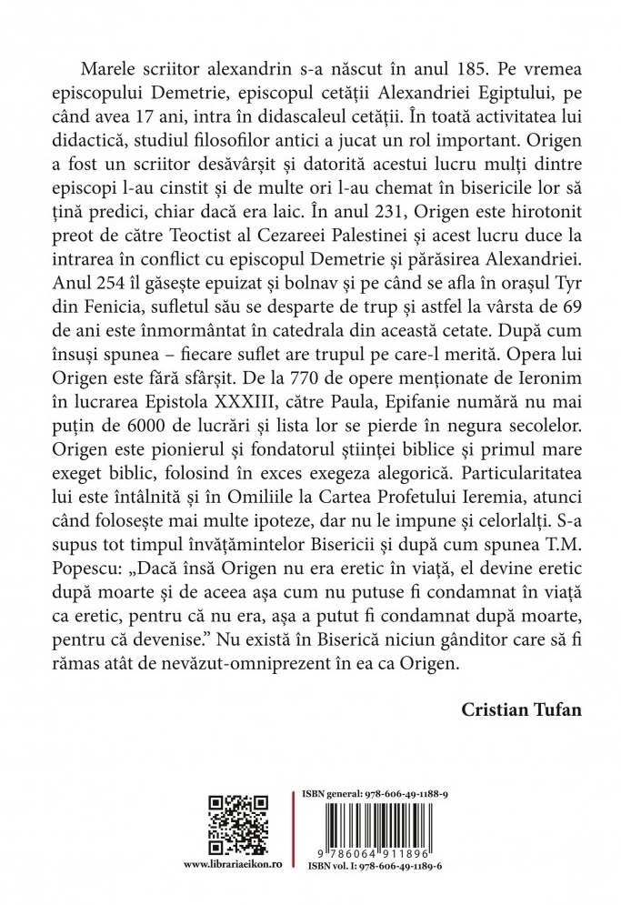 Marele scriitor alexandrin s-a născut în anul 185. Pe vremea episcopului Demetrie, episcopul cetății Alexandriei Egiptului, pe când avea 17 ani, intra în didascaleul cetății. În toată activitatea lui didactică, studiul filosofilor antici a jucat un rol important. Origen a fost un scriitor desăvârșit și datorită acestui lucru mulți dintre episcopi l-au cinstit și de multe ori l-au chemat în bisericile lor să țină predici, chiar dacă era laic.