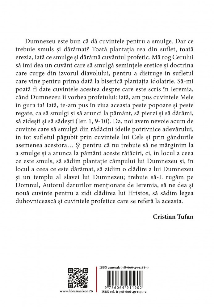 Să-mi poată fi date cuvintele acestea despre care este scris în Ieremia, când Dumnezeu îi vorbea profetului: iată, am pus cuvintele Mele în gura ta! Iată, te-am pus în ziua aceasta peste popoare și peste regate, ca să smulgi și să arunci la pământ, să pierzi și să dărâmi, să zidești și să sădești (Ier. 1, 9-10). Da, noi avem nevoie acum de cuvinte care să smulgă din rădăcini ideile potrivnice adevărului, în tot sufletul păgubit prin cuvintele lui Cels și prin gândurile asemenea acestora…
