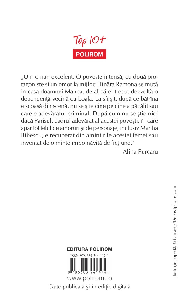 „Un roman excelent. O poveste intensă, cu două protagoniste şi un omor la mijloc. Tânăra Ramona se mută în casa doamnei Manea, de al cărei trecut dezvoltă o dependenţă vecină cu boala. La sfârşit, după ce bătrâna e scoasă din scenă, nu se ştie cine pe cine a păcălit sau care e adevăratul criminal. După cum nu se ştie nici dacă Parisul, cadrul adevărat al acestei poveşti, în care apar tot felul de amoruri şi de personaje, inclusiv Martha Bibescu, e recuperat din amintirile acestei femei sau inventat de o minte îmbolnăvită de ficţiune.” (Alina Purcaru)