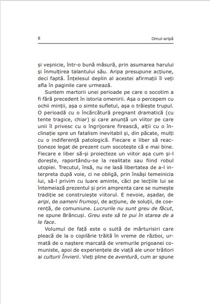 Volumul de față este o suită de mărturisiri care pleacă de la o copilărie trăită în vreme de război, urmată de o naștere marcată de vremurile prigoanei comuniste, apoi de experiențele de viață ale unor trăitori ai culturii Învierii. Vieți pline de aventură, cum ar spune unii, duse cu temeritate, demnitate, asumare, îmbrăcate în veșmintele alese ale valorilor autentice. Când pornești într-o aventură, ca să te poți bucura pe de-a întregul de ea, trebuie să fii chibzuit, să-ți pregătești harta, să știi de unde pleci și unde trebuie să ajungi, să afli calea, să nu te împovărezi cu lucruri nefolositoare, să nu le uiți pe cele absolut necesare, să-ți iei merinde și, dacă poți, să apelezi la o călăuză. Oamenii-aripă sunt socotiți de cei din jur, prin excelență, a fi aventuroși, pentru că itinerariile vieților lor se vădesc a fi călătorii de la pământ la Cer.