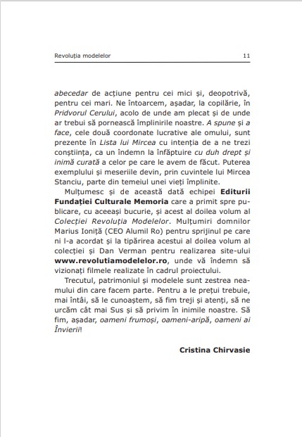 Să fim, așadar, oameni frumoși, oameni-aripă, oameni ai Învierii!Acești Oameni pe care îi veți întâlni în Colecția Revoluția modelelor sunt oblojitori de răni. Căci asta sunt modelele, oameni „rotunzi” care prin viața și profesia lor pansează rănile neștiinței și nemaiiubirii.“ (Cristina Chirvasie)
