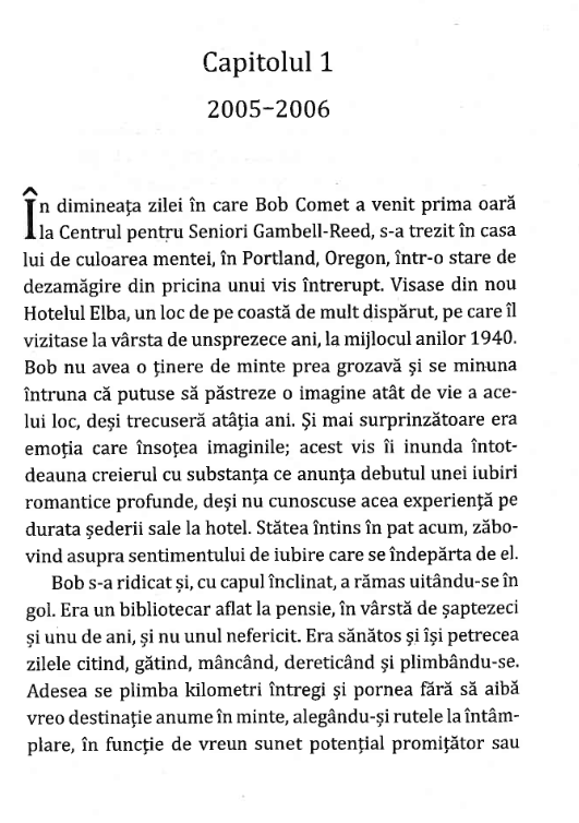 Sub exteriorul său rezervat, Bob Comet ascunde amintiri puternice: povestea unui copil care fuge de acasă în ultimele zile ale celui de-Al Doilea Război Mondial, iubirea vieții sale pierdută în favoarea celui mai bun prieten, sensul și bucuria descoperite printre rafturile bibliotecii, într-o viață trăită discret, de pe margine.