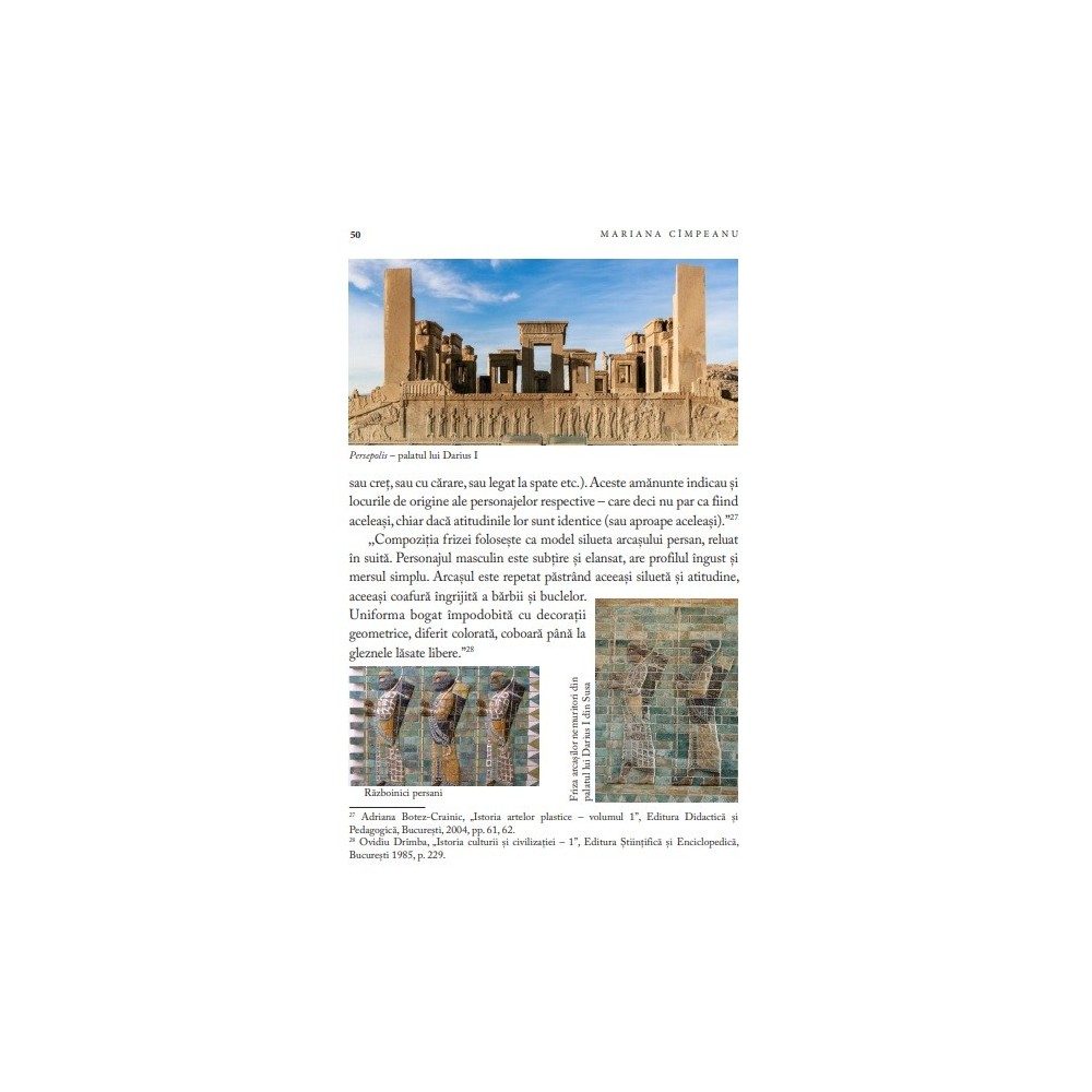 Plecând din universul artei primitive și, mai apoi, antice, autoarea poposește în principalele etape ale creației, respectiv creatori și opere însemnate, cu precădere vizând cultura, arhitectura sau sculptura, pe care le prezintă sub aspecte diverse; încadrând subiectul în spațiul variat al zonelor geografice, istorice, tradiționale, ale credințelor monoteiste sau politeiste, ale meșteșugurilor, ale vestimentației (modei).", Prof. Dr. Marcel Muntean