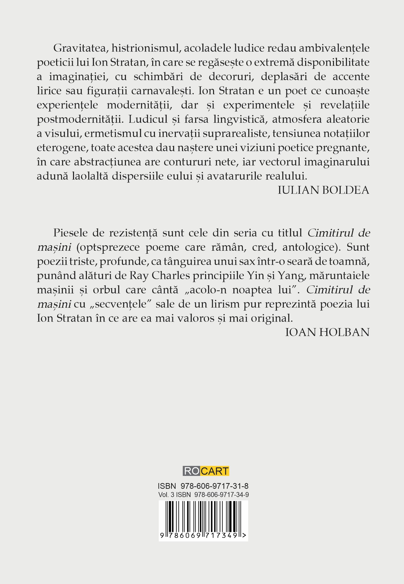 rămân, cred, antologice). Sunt poezii triste, profunde, ca tânguirea unui sax într-o seară de toamnă, punând alături de Ray Charles principiile Yin și Yang, măruntaiele mașinii și orbul care cântă „acolo-n noaptea lui”. Cimitirul de mașini cu „secvențele” sale de un lirism pur reprezintă poezia lui Ion Stratan în ce are ea mai valoros și mai original. (IOAN HOLBAN)