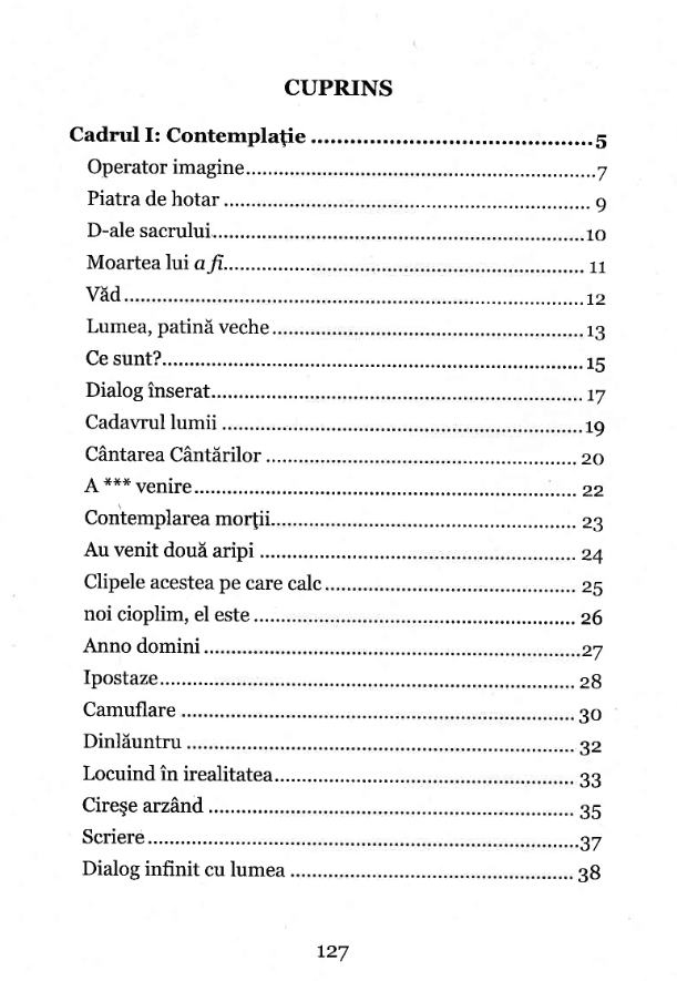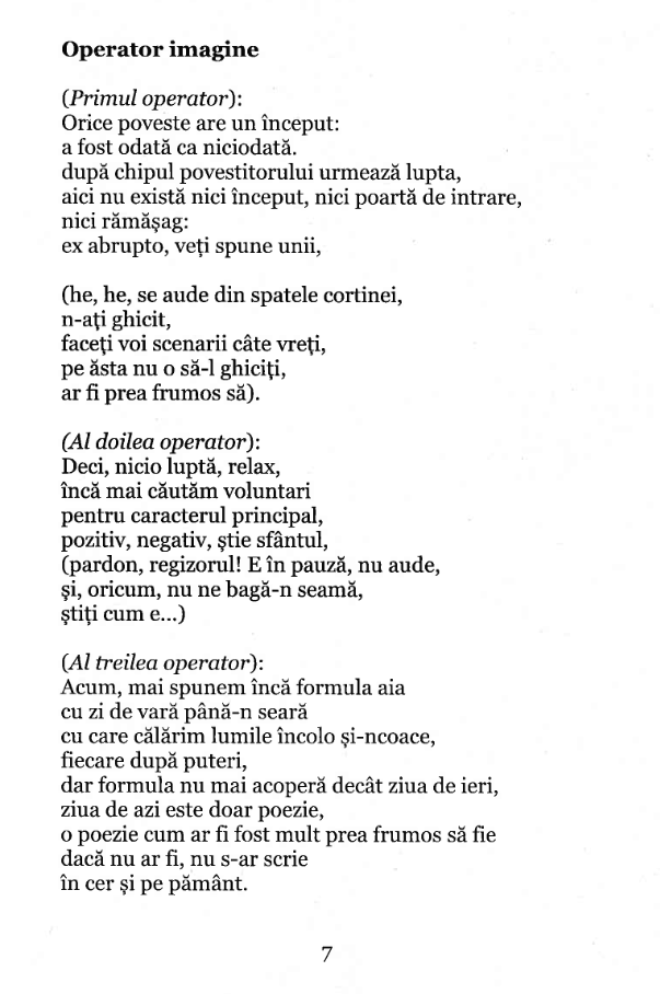 Un orchestrator histrionic, numit operator de imagine, pune in scena teatrul existential foarte profund si versatil imaginat in volum, el cuprinzand insidios totul, de la nastere la moarte si, mai ales, la iubire, tema principala a cartii fiind tratata in cheia unei senzualitati rafinate care trimite la Cantarea Cantarilor.