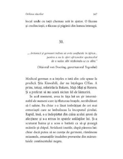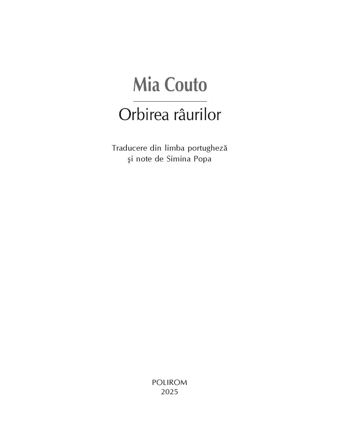 În Mozambicul sfârşitului de epocă colonială, o tragedie reală – masacrarea unor soldaţi africani şi a unui militar portughez de către armata germană în 1914 – devine punctul de plecare pentru o naraţiune intensă şi profundă în care vocile celor uitaţi ies la lumină. Personajele diverse – o portugheză care pleacă în Mozambic să-şi salveze fiica, un preot care intenţionează să rescrie Biblia, un soldat mozambican care se vede nevoit să se amestece printre albi şi să lupte alături de ei, un maior şi medic german răspunzător pentru diverse ordine brutale – se intersectează treptat în paginile romanului şi trebuie să facă faţă unui eveniment fără precedent: orbirea râurilor. Mizând pe o naraţiune bogată în simboluri şi proverbe africane, cu fragmente ce alternează între personaje şi timpuri, Mia Couto ne invită într-un univers impregnat de realism magic, dar profund ancorat în durerea istoriei. Orbirea râurilor nu este doar o poveste despre colonialism şi război, ci şi despre ce înseamnă să aparţii, să iubeşti şi să ierţi. O meditaţie răscolitoare despre memorie, vinovăţie şi miracolul regăsirii – scrisă de unul dintre cei mai mari povestitori de limbă portugheză.