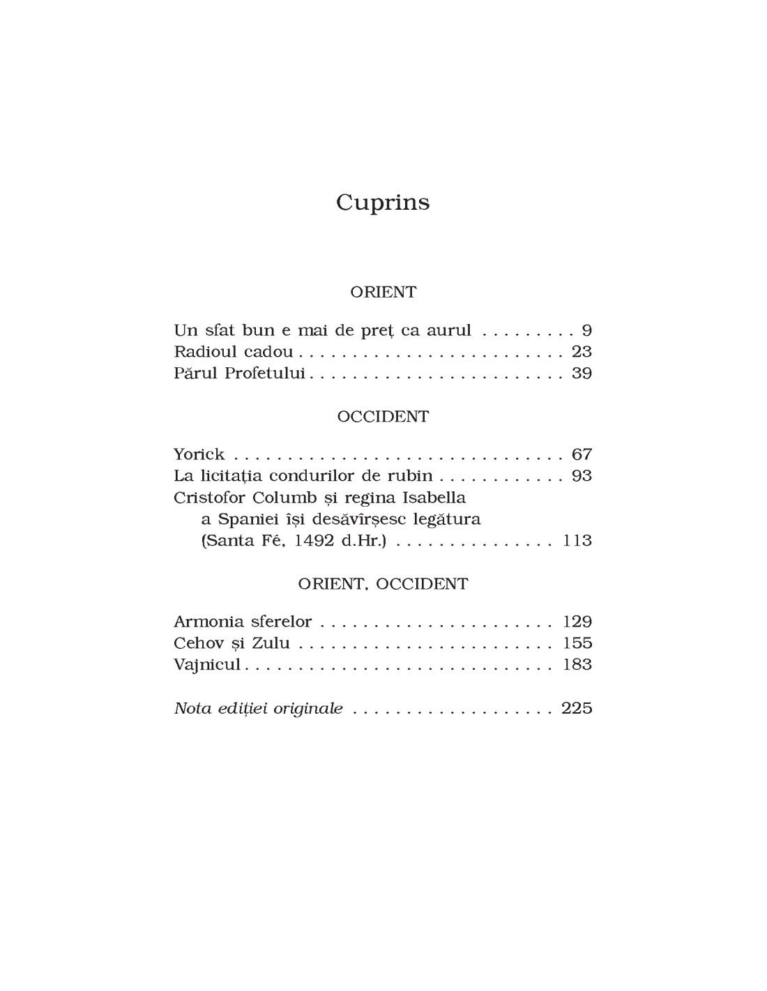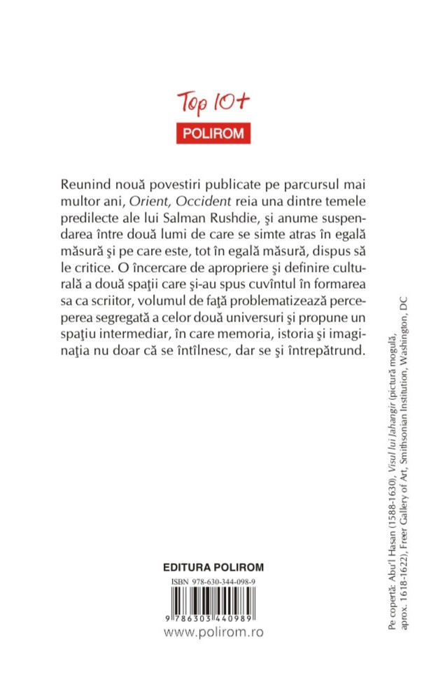 Reunind nouă povestiri publicate pe parcursul mai multor ani, Orient, Occident reia una dintre temele predilecte ale lui Salman Rushdie, şi anume suspendarea între două lumi de care se simte atras în egală măsură şi pe care este, tot în egală măsură, dispus să le critice. O încercare de apropriere şi definire culturală a două spaţii care şi-au spus cuvântul în formarea sa ca scriitor, volumul de faţă problematizează perceperea segregată a celor două universuri şi propune un spaţiu intermediar, în care memoria, istoria şi imaginaţia nu doar că se întâlnesc, dar se şi întrepătrund.