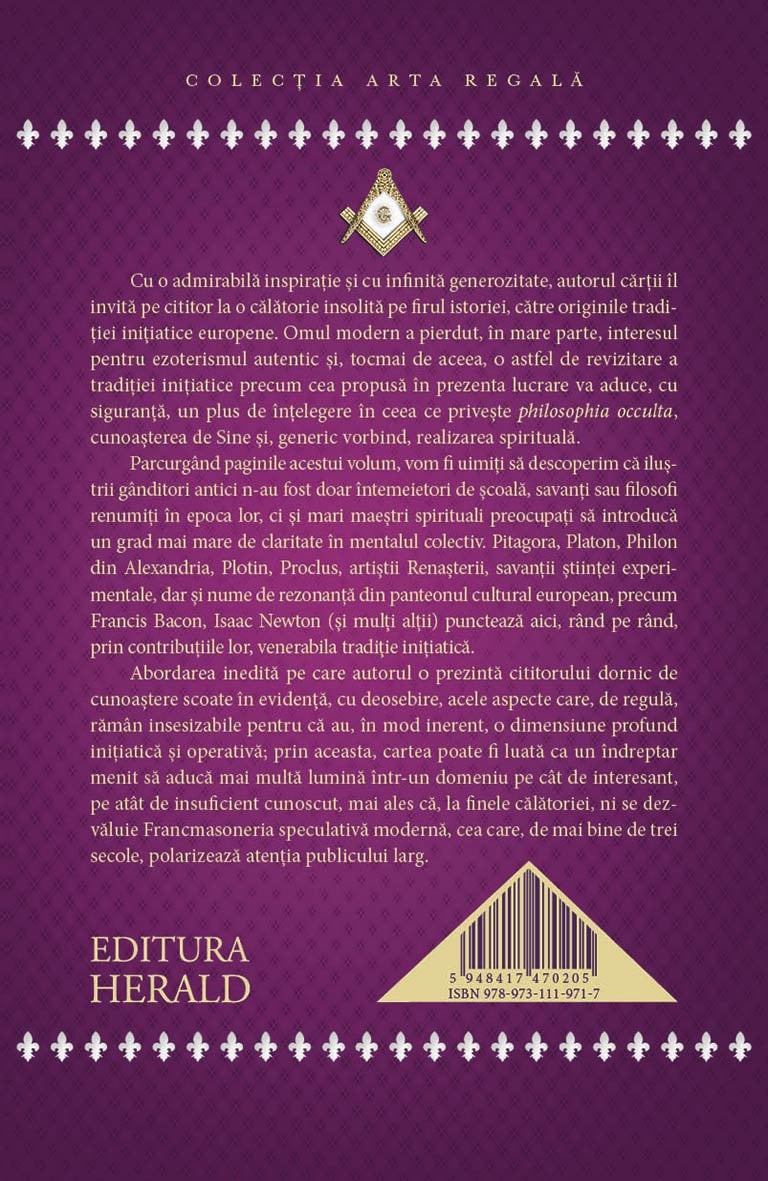 Parcurgand paginile acestui volum, vom fi uimiti sa descoperim ca ilustrii ganditori antici n-au fost doar intemeietori de scoala, savanti sau filosofi renumiti in epoca lor, ci si mari maestri spirituali preocupati sa introduca un grad mai mare de claritate in mentalul colectiv. Pitagora, Platon, Philon din Alexandria, Plotin, Proclus, artistii Renasterii, savantii stiintei experimentale, dar si nume de rezonanta din panteonul cultural european, precum Francis Bacon, Isaac Newton (si multi altii) puncteaza aici, rand pe rand, prin contributiile lor, venerabila traditie initiatica.