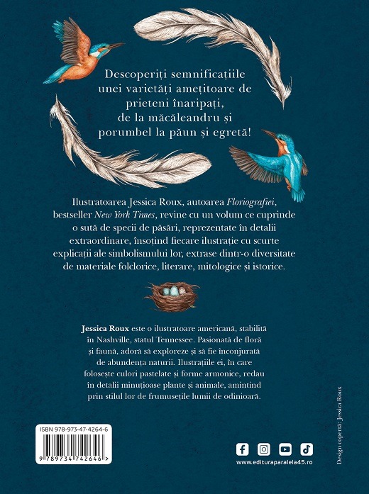 Ilustratoarea Jessica Roux, autoarea Floriografiei, bestseller New York Times, revine cu un volum ce cuprinde o sută de specii de păsări, reprezentate în detalii extraordinare, însoțind fiecare ilustrație cu scurte explicații ale simbolismului lor, extrase dintr-o diversitate de materiale folclorice, literare, mitologice și istorice.