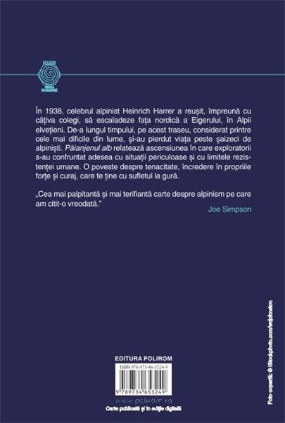 In 1938, celebrul alpinist Heinrich Harrer a reusit, impreuna cu citiva colegi, sa escaladeze fata nordica a Eigerului, in Alpii elvetieni. De-a lungul timpului, pe acest traseu, considerat printre cele mai dificile din lume, si-au pierdut viata peste saizeci de alpinisti. Paianjenul alb relateaza ascensiunea in care exploratorii s-au confruntat adesea cu situatii periculoase si cu limitele rezistentei umane. O poveste despre tenacitate, incredere in propriile forte si curaj, care te tine cu sufletul la gura.