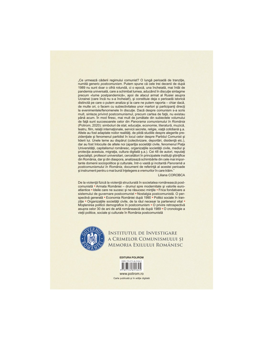 „Ce urmează căderii regimului comunist? O lungă perioadă de tranziţie, numită generic postcomunism. Putem spune că cele trei decenii de după 1989 nu sunt doar o cifră rotundă, ci o epocă, una încheiată, mai întâi de pandemia universală, care a schimbat lumea, aducând în discuţie sintagme precum «lume postpandemică», apoi de atacul armat al Rusiei asupra Ucrainei (care încă nu s-a încheiat!), şi constituie deja o perioadă istorică distinctă pe care o putem analiza şi la care ne putem raporta – chiar dacă, de multe ori, o facem cu subiectivitatea unor martori şi participanţi direcţi la evenimentele/fenomenele în discuţie. Dacă despre comunism s-a scris mult, sinteze privind postcomunismul, precum cartea de faţă, nu existau până acum. În mod firesc, mai mult de jumătate din subiectele volumului de faţă sunt succesoarele celor din Panorama comunismului în România (Polirom, 2020): simboluri de stat, educaţie, economie, literatură, muzică, teatru, film, relaţii internaţionale, servicii secrete, religie, viaţă cotidiană ş.a. Altele au fost adaptate noilor realităţi, de pildă studiile despre alegerile prezidenţiale şi fenomenul partidist în locul celor despre Partidul Comunist şi liderii lui. Unele teme au dispărut (colectivizare, deportări, disidenţă etc.), dar au fost înlocuite de altele noi (apariţia societăţii civile, fenomenul Piaţa Universităţii, capitalismul românesc, organizaţiile societăţii civile, mediul şi protecţia acestuia, migraţia, cultura digitală ş.a.). Cei 48 de autori, reputaţi specialişti, profesori universitari, cercetători în principalele instituţii ştiinţifice din România, dar şi din diaspora, analizează schimbările din cele mai importante domenii sociopolitice şi culturale, într-o vastă şi incitantă Panoramă a postcomunismului în România, document de referinţă al acestei perioade şi instrument pentru o mai bună înţelegere a vremurilor în care trăim.” (Liliana Corobca)
