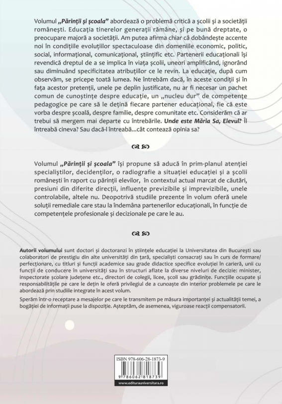 Acest volum isi propune sa aduca in prim planul atentiei specialistilor, decidentilor, o radiografie a situatiei educatiei si a scolii romanesti in raport cu parintii elevilor, in contextul actual marcat de cautari, presiuni din diferite directii, influente previzibile si imprevizibile, unele controlabile, altele nu. Deopotriva studiile prezente in volum ofera unele solutii remediale care stau la indemana partenerilor educationali, in functie de competentele profesionale si decizionale pe care le au.