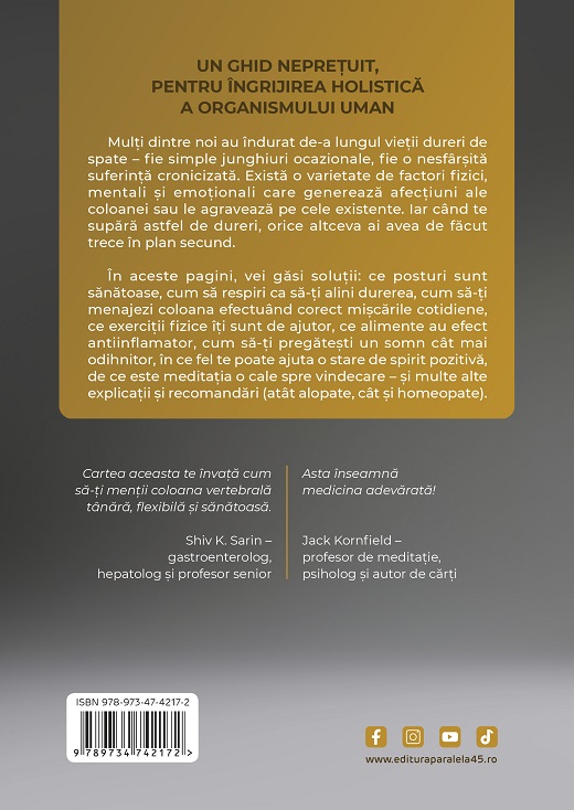 În aceste pagini, vei găsi soluții: ce posturi sunt sănătoase, cum să respiri ca să-ți alini durerea, cum să-ți menajezi coloana efectuând corect mișcările cotidiene, ce exerciții fizice îți sunt de ajutor, ce alimente au efect antiinflamator, cum să-ți pregătești un somn cât mai odihnitor, în ce fel te poate ajuta o stare de spirit pozitivă, de ce este meditația o cale spre vindecare – și multe alte explicații și recomandări (atât alopate, cât și homeopate).