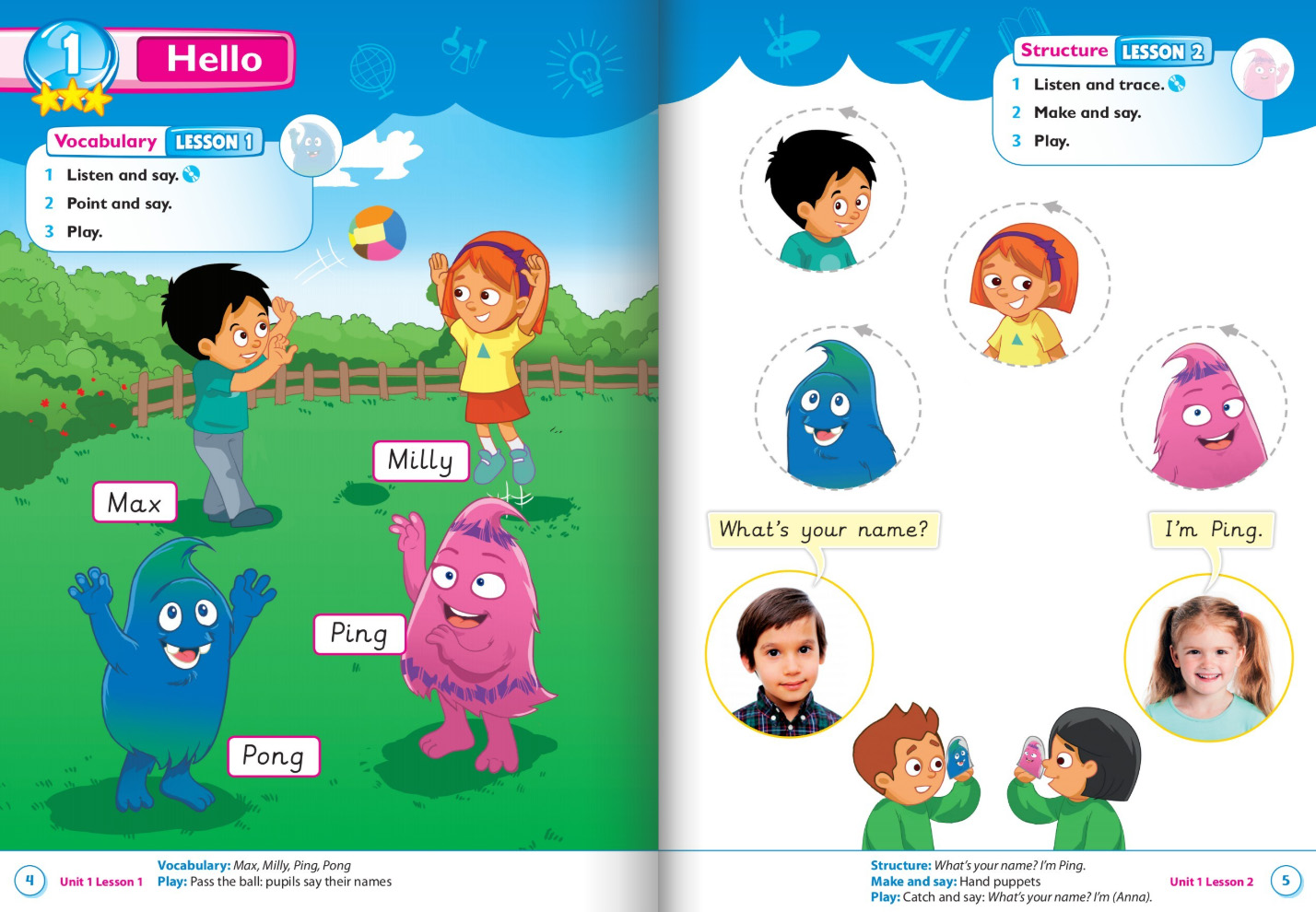• lessons which gradually introduce vocabulary and simple structures as well as the English alphabet and numbers.