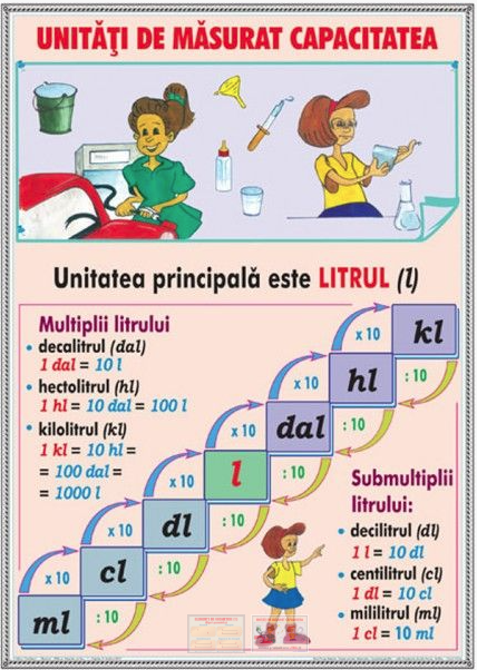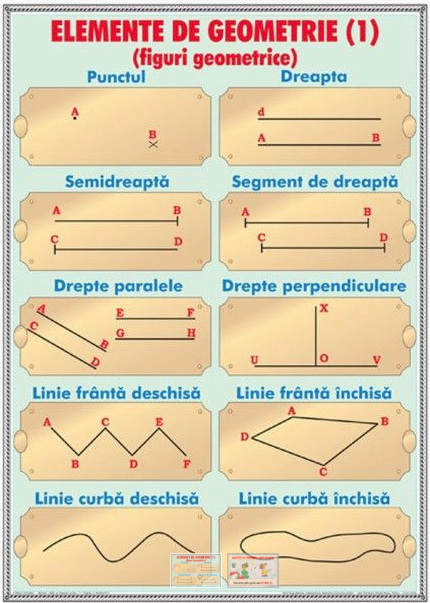 Planşa cuprinde 2 teme distincte, ordonate faţă-verso: ELEMENTE DE GEOMETRIE, cu exemplificarea noțiunilor geometrice elementare (punct, dreaptă, semidreaptă, drepte palalele, drepte perpendiculare, linie frântă deschisă, linie frântă închisă, linie curbă deschisă, linie curbă închisă) și UNITĂȚI DE MĂSURARE A CAPACITĂȚII, cu multiplii și submultiplii litrului.