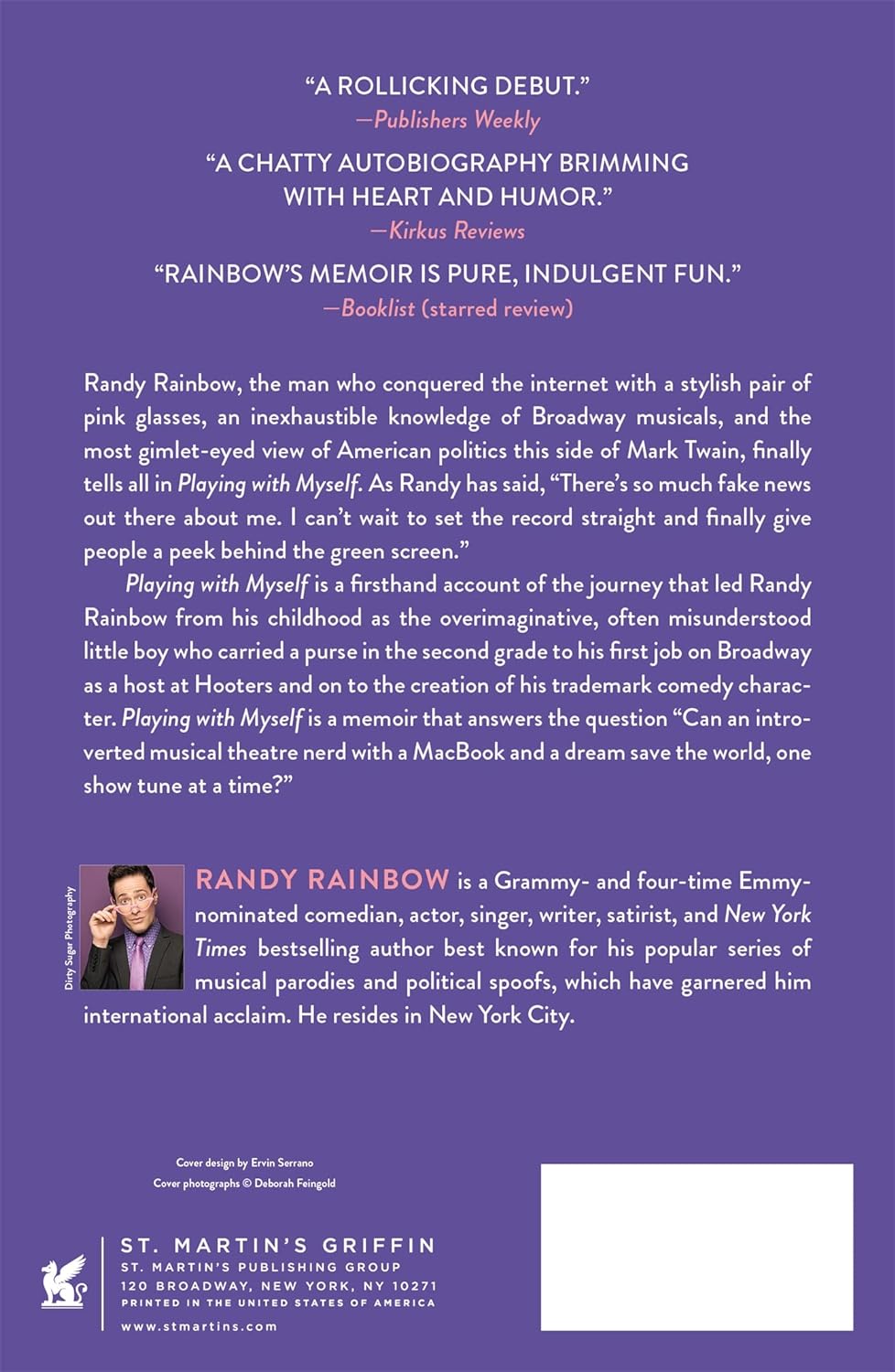 Instant New York Times, USA Today, and Wall Street Journal Bestseller! An intimate and light-hearted memoir by viral sensation and three-time Emmy-nominated musical comedian Randy Rainbow that takes readers through his life--the highs, the lows, the lipstick, the pink glasses, and the show tunes. Randy Rainbow, the man who conquered the Internet with a stylish pair of pink glasses, an inexhaustible knowledge of Broadway musicals, and the most gimlet-eyed view of American politics this side of Mark Twain finally tells all in Playing with Myself, a memoir sure to cause more than a few readers to begin singing one of his greatest hits like "A Spoonful of Clorox" or "Cover Your Freakin' Face." As Randy has said, "There's so much fake news out there about me. I can't wait to set the record straight and finally give people a peek behind the green screen."