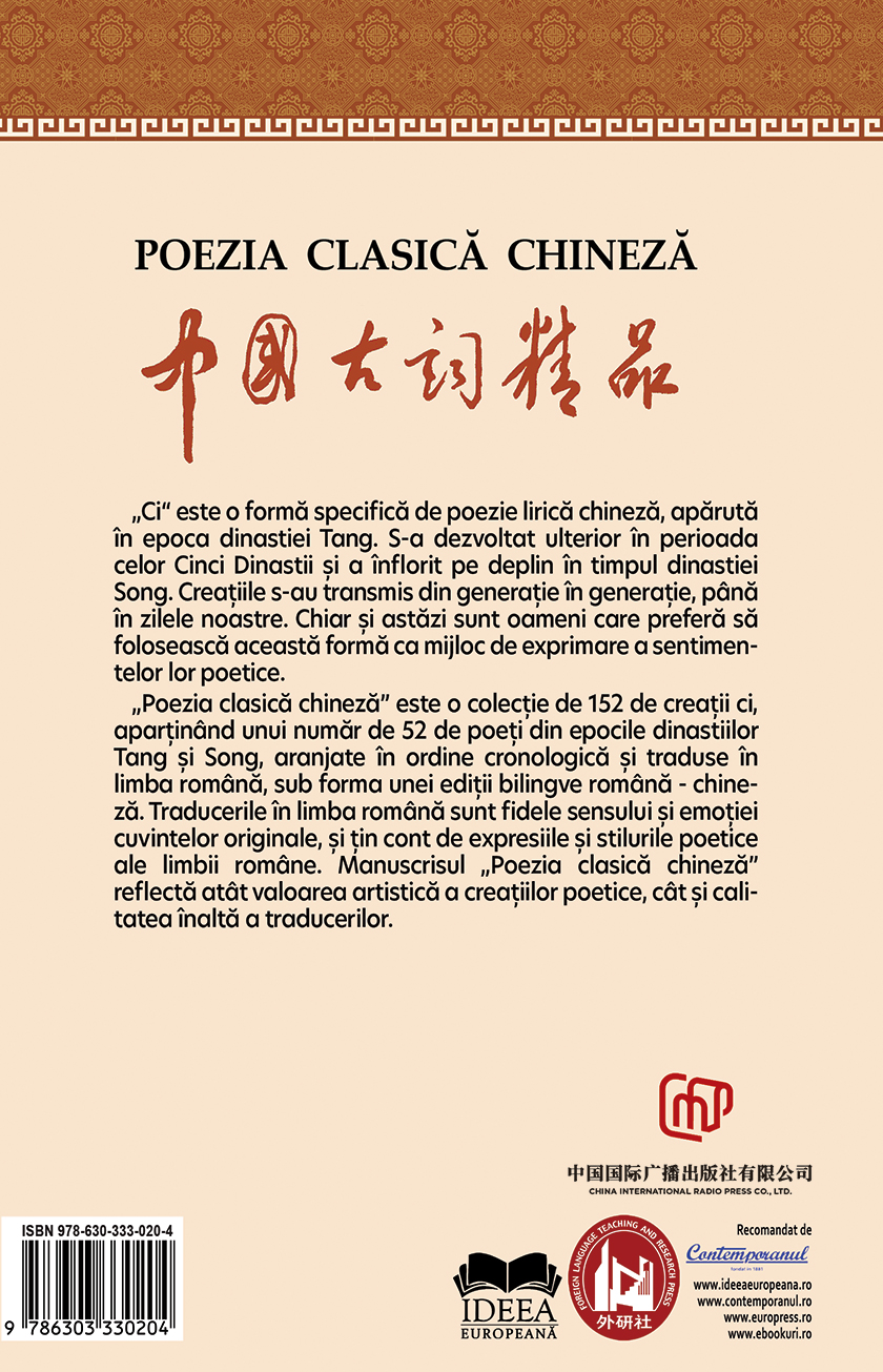 „Poezia clasică chineză” este o colecție de 152 de creații ci, aparținând unui număr de 52 de poeți din epocile dinastiilor Tang şi Song, aranjate în ordine cronologică și traduse în limba română, sub forma unei ediții bilingve română – chineză. Traducerile în limba română sunt fidele sensului și emoției cuvintelor originale, și țin cont de expresiile și stilurile poetice ale limbii române.