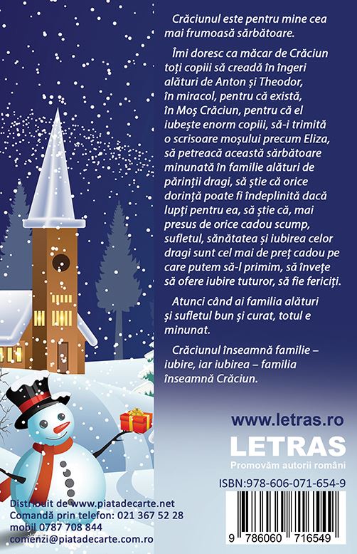 Imi doresc ca macar de Craciun toti copiii sa creada in ingeri alaturi de Anton si Theodor, in miracol, pentru ca exista, in Mos Craciun, pentru ca el iubeste enorm copiii, sa-i trimita o scrisoare mosului precum Eliza, sa petreaca aceasta sarbatoare minunata in familie alaturi de parintii dragi, sa stie ca orice dorinta poate fi indeplinita daca lupti pentru ea, sa stie ca, mai presus de orice cadou scump, sufletul, sanatatea si iubirea celor dragi sunt cel mai de pret cadou pe care putem sa-l primim, sa invete sa ofere iubire tuturor, sa fie fericiti.