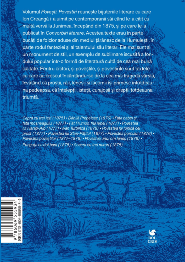 Volumul Povesti. Povestiri reuneste bijuteriile literare cu care Ion Creanga i-a uimit pe contemporanii sai cand le-a citit cu multa verva la Junimea, incepand din 1875, si pe care le-a publicat în Convorbiri literare. Acestea texte erau în parte bucati de folclor aduse din mediul taranesc de la Humulesti, în parte rodul fanteziei si al talentului sau literar.