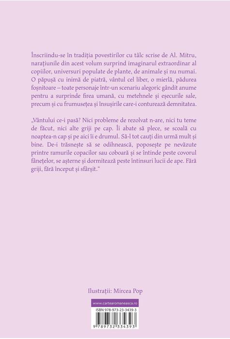 Înscriindu-se în tradiția povestirilor cu tâlc scrise de Al. Mitru, narațiunile din acest volum surprind imaginarul extraordinar al copiilor, universuri populate de plante, animale și nu numai.