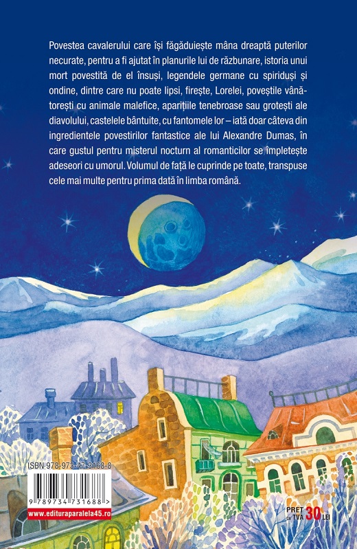 Povestea cavalerului care își făgăduiește mâna dreaptă puterilor necurate, pentru a fi ajutat în planurile lui de răzbunare, istoria unui mort povestită de el însuși, legendele germane cu spiriduși şi ondine, dintre care nu poate lipsi, firește, Lorelei, poveștile vânătorești cu animale malefice, aparițiile tenebroase sau grotești ale diavolului, castelele bântuite, cu fantomele lor – iată doar câteva din ingredientele povestirilor fantastice ale Alexandre Dumas, în care gustul pentru misterul nocturn al romanticilor se împletește adeseori cu umorul. Volumul de față le cuprinde pe toate, transpuse cele mai multe pentru prima dată în limba română.