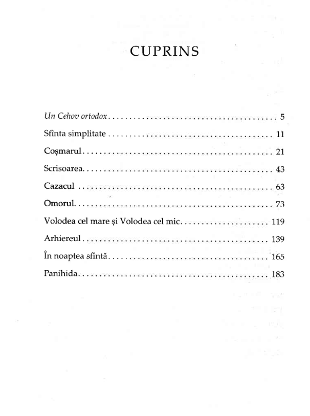 Antologia de faţă este, fără îndoială, o baie de lumină şi un izvor care ţîşneşte curat din adîncurile celei mai autentice tradiţii evanghelice şi patristice. Povestirile adunate aici au fost scrise în diferite perioade ale vieții autorului, exprimînd preocuparea neîncetată pe care a avut-o Cehov pentru taina credinței. Cititorul, credincios sau nu, are ocazia să vadă viața cotidiană a credincioșilor ortodocși, cu frămîntările și sclipirile ei, oglindite de pana unuia dintre cei mai mari scriitori pe care i-a avut omenirea. (Savatie Baştovoi)