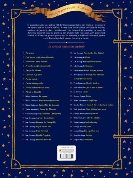 În această colecţie vor apărea 100 de titluri reprezentative din folclorul românesc și din opera marilor scriitori români. Textele sunt recomandate spre lectură elevilor, conform programei școlare. La elaborarea colecţiei participă specialiști de marcă în domeniul editorial, inclusiv graficieni din ambele state românești, prin acest efort comun realizându‑se, pentru prima oară în România, o bibliotecă ilustrată pentru copii de o netăgăduită valoare literară și artistică.