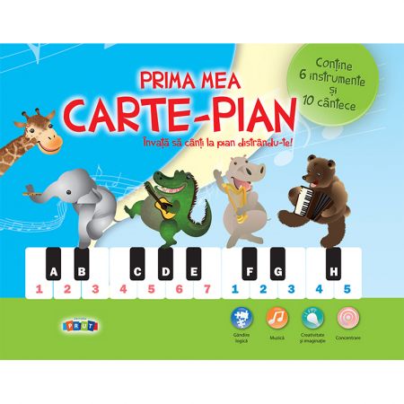Aceasta carte minunata il va invata pe cel mic sa cante la pian distrandu-se! Copilul poate sa cante cu vocea si la pian urmarind notele muzicale sau cifrele de sub portativ si gasind aceleasi semne grafice pe claviatura pianului. Cartea contine 10 cantece cunoscute pentru copii si un instrument-jucarie electronic. Modulul electronic include butoane cu 10 melodii preinregistrate si 6 instrumente muzicale clasice, pe care copilul le poate asculta alternativ in timp ce canta o melodie. Cel mic poate canta o melodie din carte sau poate crea propria melodie, pe care o poate inregistra sau reda cu ajutorul unor butoane speciale. In timp ce copilul apasa pe clape, 4 leduri colorate lumineaza intermitent odata cu melodia. Cartea dezvolta dexteritatea si capacitatea de concentrare, gandirea logica, creativitatea si imaginatia copilului.