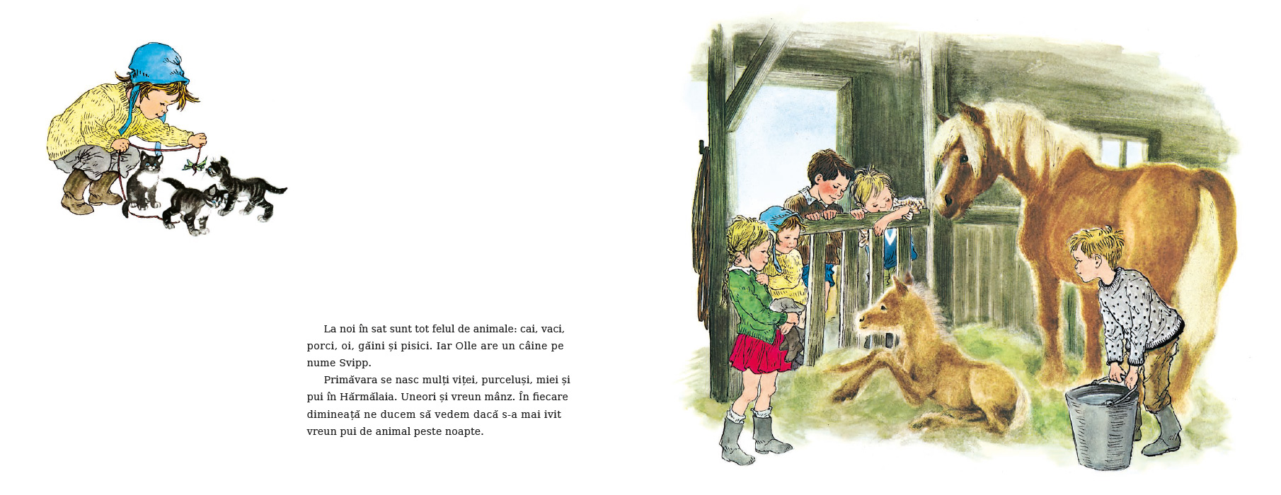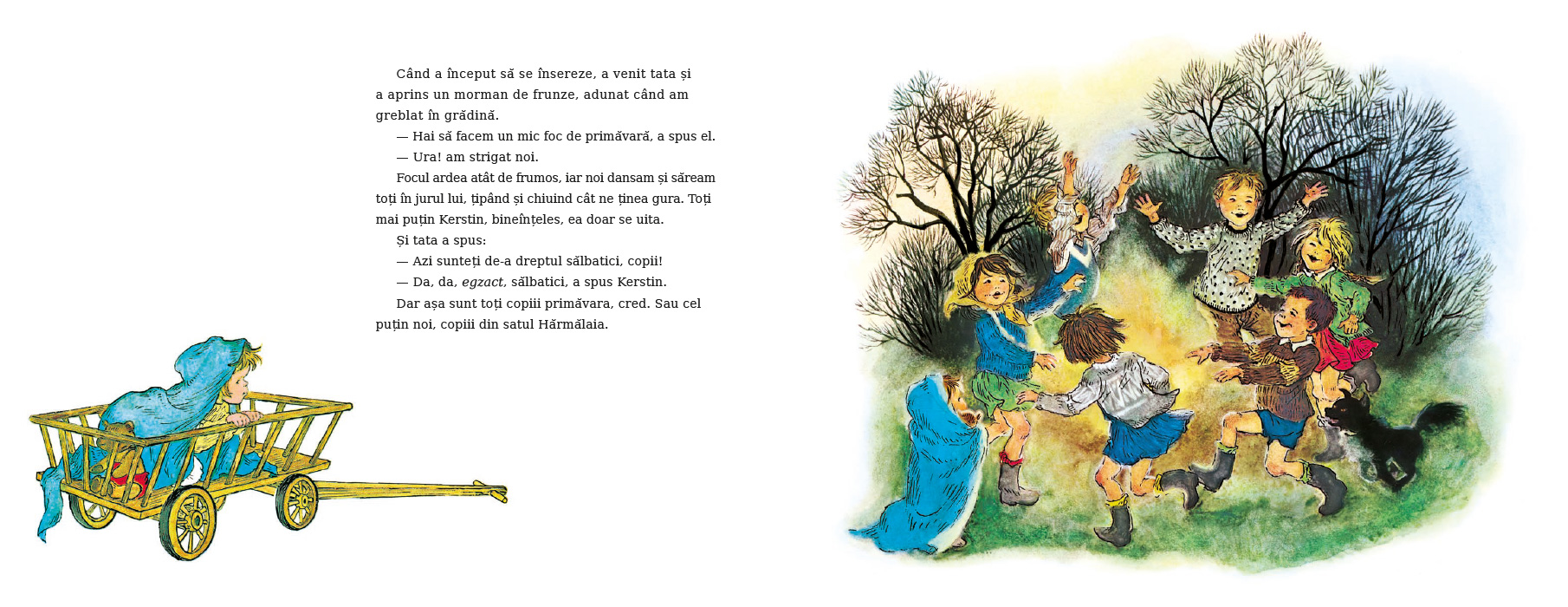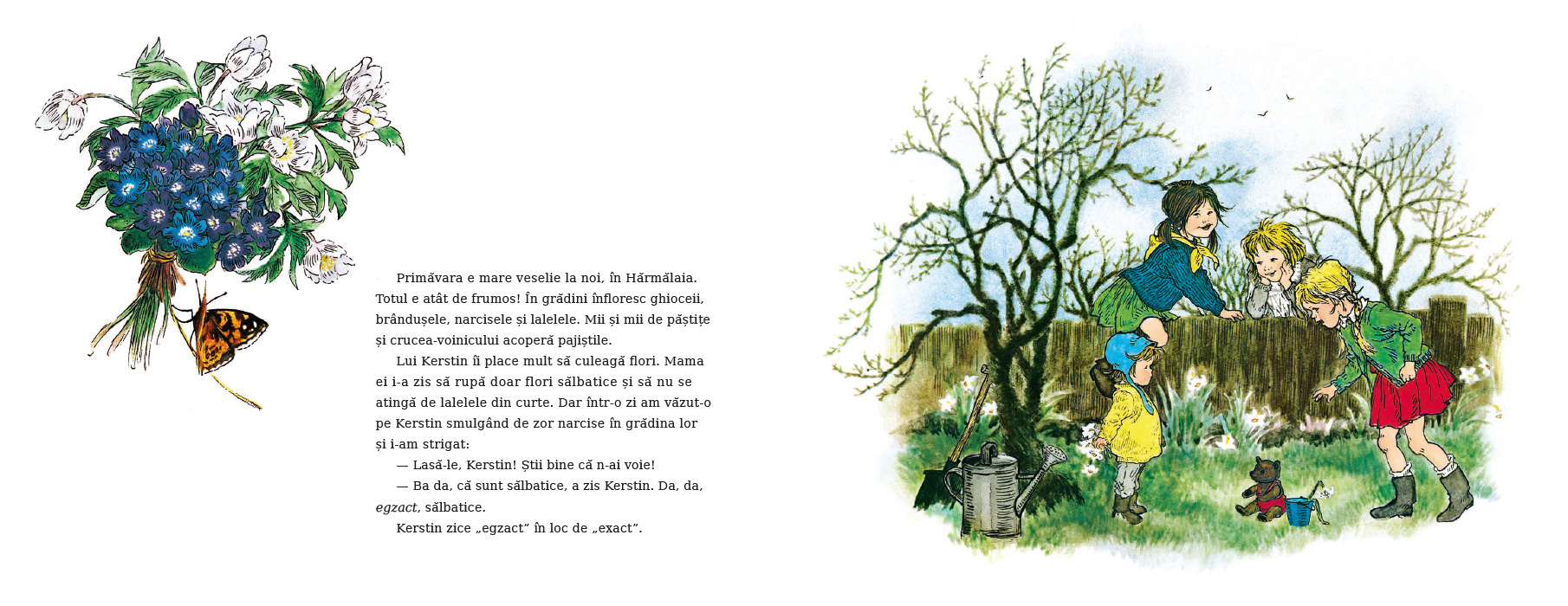 În satul Hărmălaia, primăvara este o sărbătoare pe care copiii o trăiesc din plin. Hoinăresc pe pajiști și prin grădini, țopăie prin bălți, se cațără pe garduri sau pe magazia de lemne, fugăresc pisica, alunecă prin noroiul de pe ulițe, cad (din întâmplare) în pârâiaș — oriunde îi poartă pașii, e ceva interesant de făcut sau de văzut.