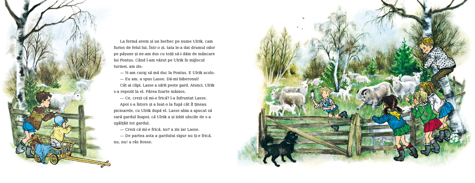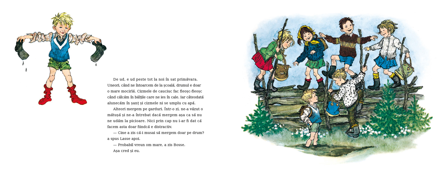 Alteori mergem pe garduri. Într-o zi, ne-a văzut o mătușă și ne-a întrebat dacă mergem așa ca să nu ne udăm la picioare. Nici prin cap nu i-ar fi dat că facem asta doar fiindcă e distractiv. „Cine a zis că-i musai să mergem doar pe drum?“ a spus Lasse apoi. „Probabil vreun om mare“, a zis Bosse. „Așa cred și eu“, a răspuns Lasse.