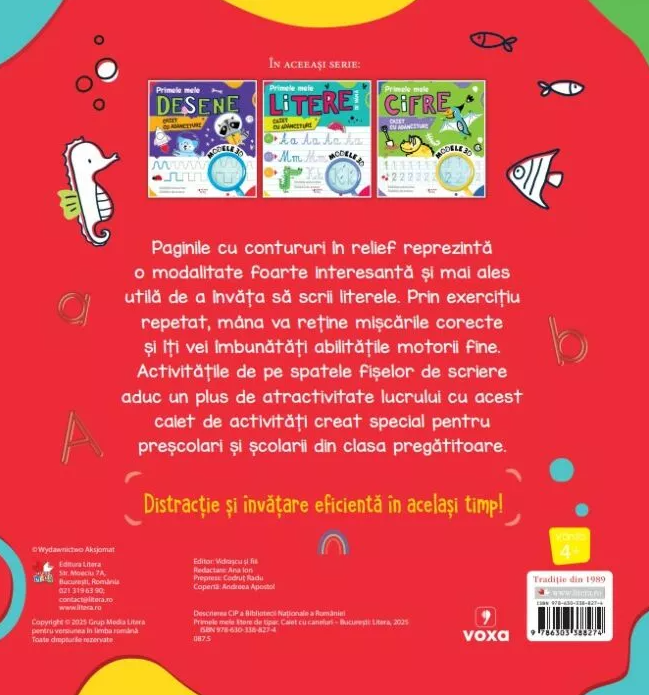 Prin exerciţiu repetat, mâna va reţine mișcările corecte și îţi vei îmbunătăți abilitățile motorii fine. Activităţile de pe spatele fișelor de scriere aduc un plus de atractivitate lucrului cu acest caiet de activităţi creat special pentru preșcolari și școlarii din clasa pregătitoare.