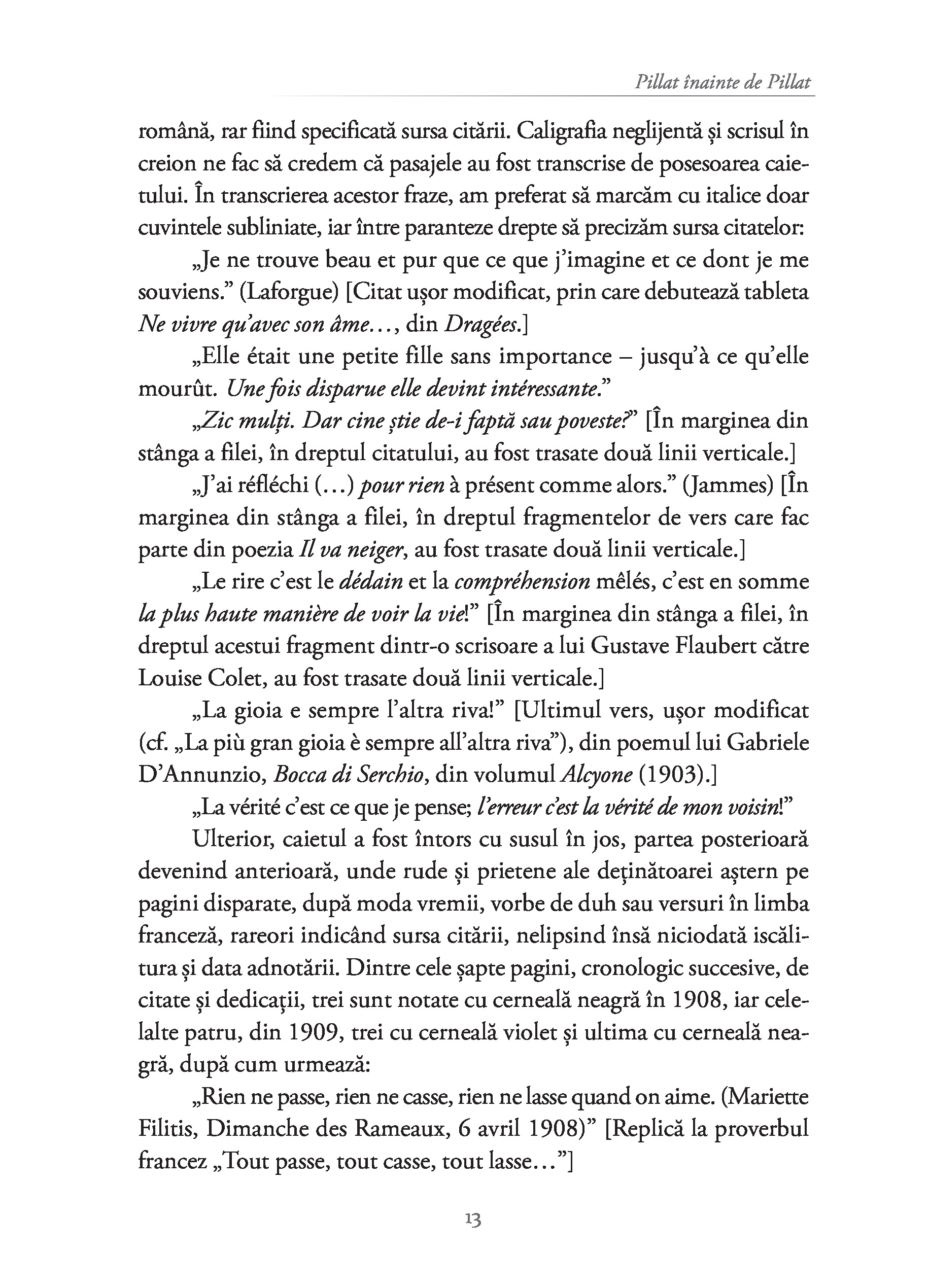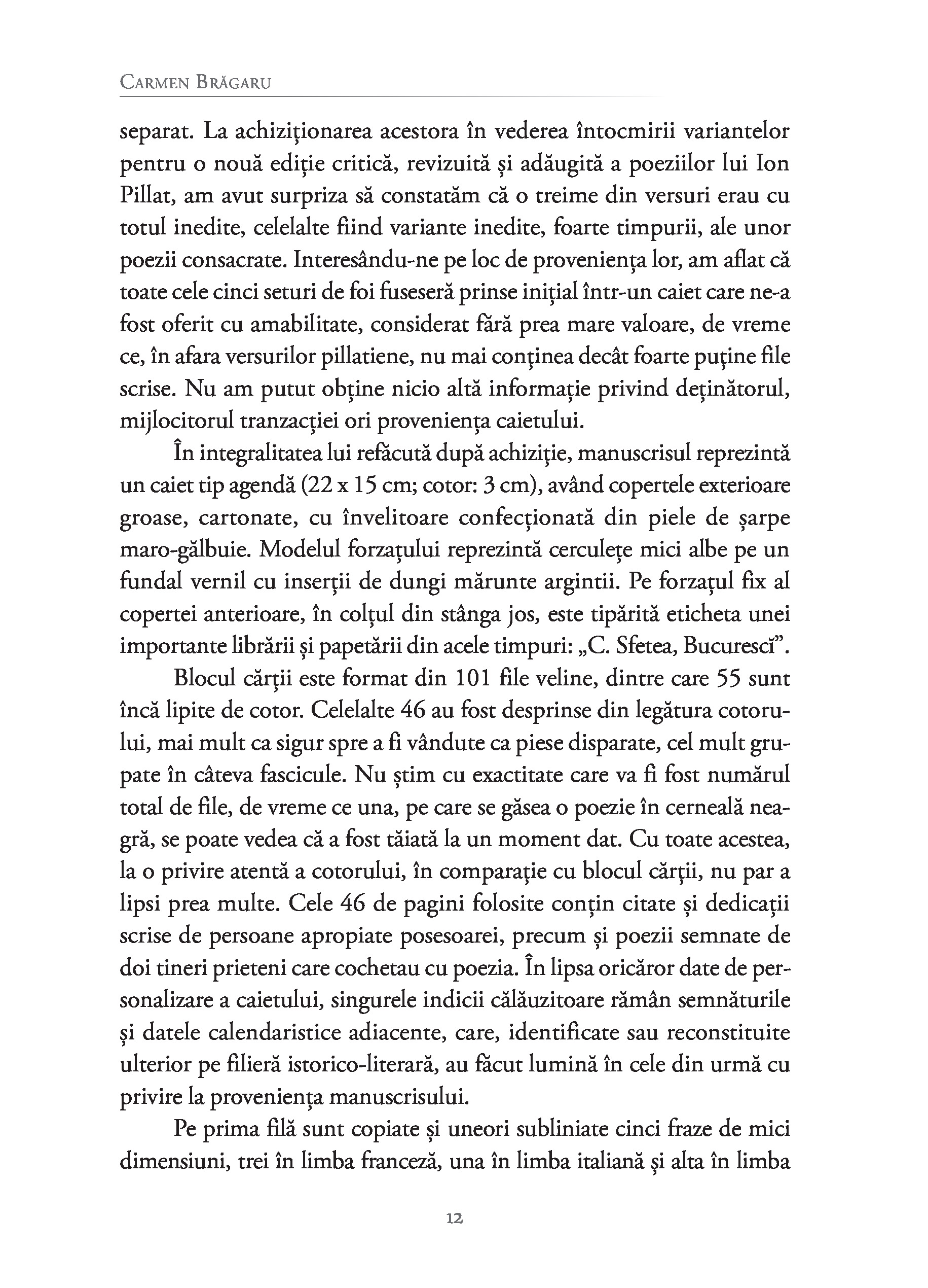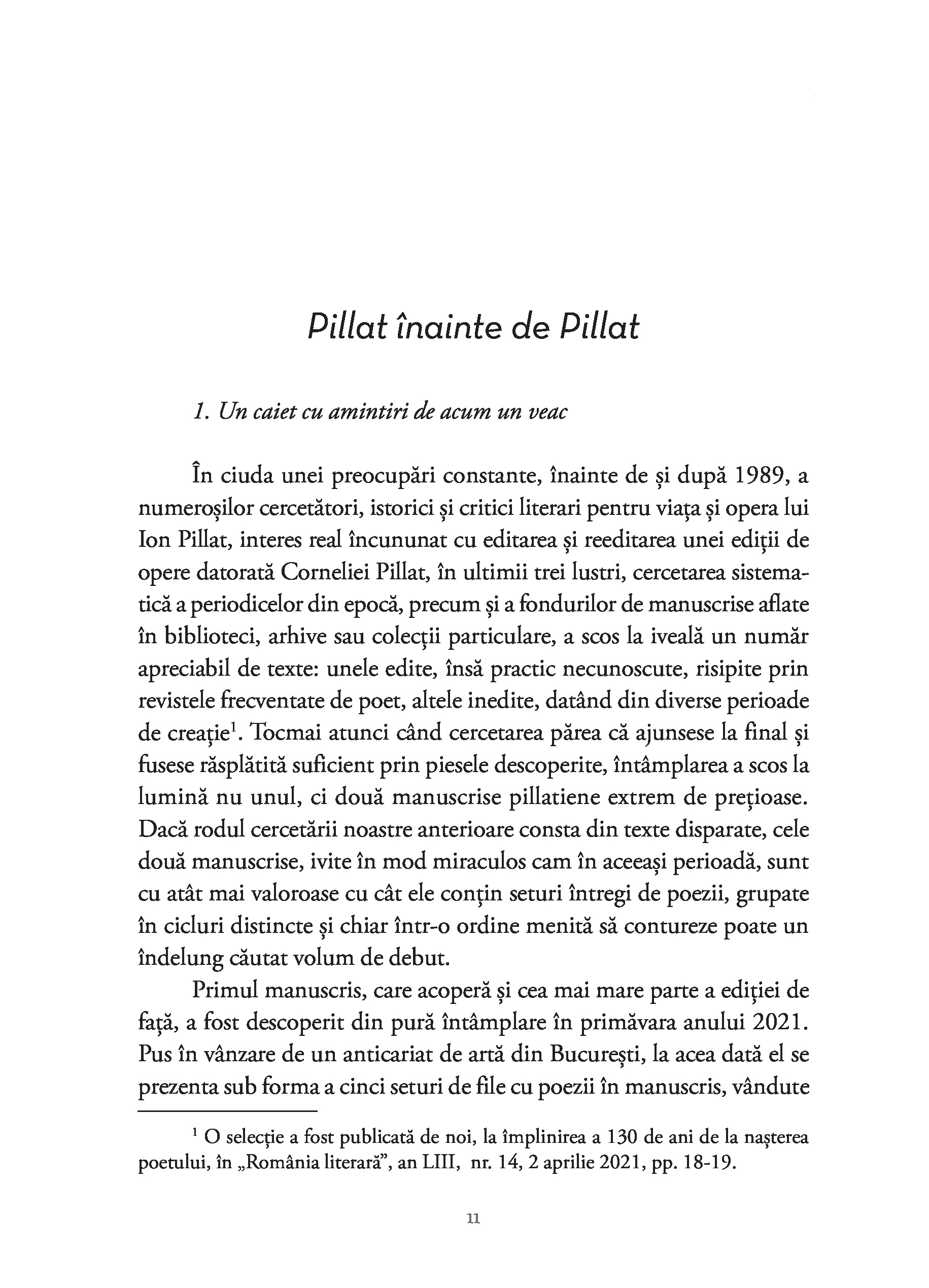 "Două manuscrise necunoscute, cu numeroase versuri inedite și variante timpurii scrise de Ion Pillat între 1905-1912, au ieșit la iveală în ultimii trei ani, într-un mod aproape miraculos. Întreaga poezie pillatiană de mai târziu, cu temele ei recurente, se regăsește in nuce în aceste prime producții lirice, trasate cu linii oricât de nesigure. Numai o privire grăbită le-ar putea trata ca pe niște simple exerciții pentru șlefuirea meșteșugului versificării. Cu toate scăderile inerente, privite empatic de prietenul V. Voiculescu drept „inevitabile ușurătăți ale începuturilor”, și în ciuda influențelor evidente, cele dintâi încercări lirice ale lui Ion Pillat, „comparate cu versurile contemporanilor, mulți ciraci macedonskieni sau epigoni eminescieni, au prestanță și pot numi, fără vreo umbră de îndoială, un poet”, după cum observa la un moment dat Cornel Ungureanu. Nu întâmplător, Titu Maiorescu, scrutând viitorul încă o dată profetic, a sesizat în versurile timpurii, așternute de tânărul Ion Pillat într-un caiet din 1911, germenii viitoarei păduri, reținând spre publicare în „Convorbiri literare” nu o singură poezie, ci mai multe." - Carmen Brăgaru