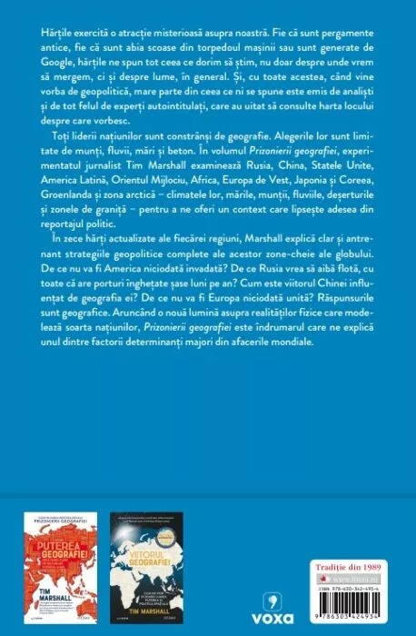 Toți liderii națiunilor sunt constrâșni de geografie. Alegerile lor sunt limitate de munți, fluvii, mări și beton. În volumul Prizonierii geografiei, experimentatul jurnalist Tim Marshall examinează Rusia, China, Statele Unite, America Latină, Orientul Mijlociu, Africa, Europa de Vest, Japonia și Coreea, Groenlanda și zona arctică – climatele lor, mările, munții, fluviile, deerturile și zonele de graniță – pentru a ne oferi un context care lipsete adesea din reportajul politic.