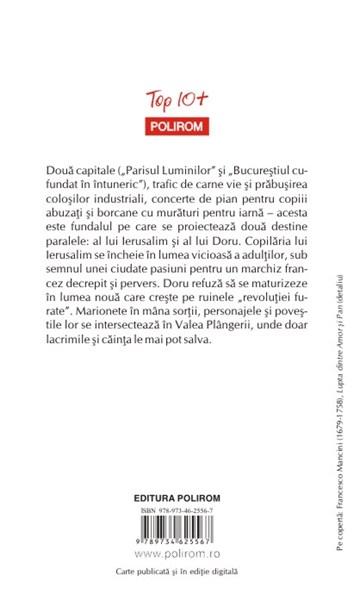 Doua capitale („Parisul Luminilor” si „Bucurestiul cufundat in intuneric”), trafic de carne vie si prabusirea colosilor industriali, concerte de pian pentru copiii abuzati si borcane cu muraturi pentru iarna – acesta este fundalul pe care se proiecteaza doua destine paralele: al lui Ierusalim si al lui Doru. Copilaria lui Ierusalim se incheie in lumea vicioasa a adultilor, sub semnul unei ciudate pasiuni pentru un marchiz francez decrepit si pervers. Doru refuza sa se maturizeze in lumea noua care creste pe ruinele „revolutiei furate”. Marionete in mina sortii, personajele si povestile lor se intersecteaza in Valea Plingerii, unde doar lacrimile si cainta le mai pot salva.